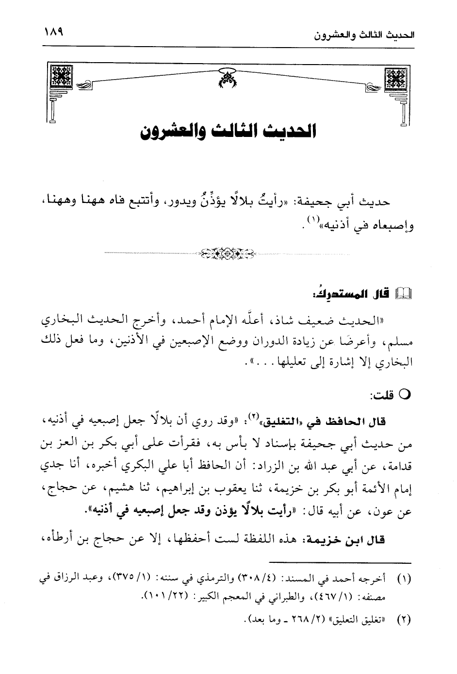 قال الحافظ في "التغليق" (¬2): "وقد روي أن بلالاً جعل إصبعيه في أذنيه، من حديث أبي جحيفة بإسناد لا بأس به، فقرأت على أبي بكر بن العز بن قدامة، عن أبي عبد الله بن الزراد: أن الحافظ أبا علي البكري أخبره، أنا جدي إمام الأئمة أبو بكر بن خزيمة، ثنا يعقوب بن إبراهيم، ثنا هشيم، عن حجاج، عن عون، عن أبيه قال: "رأيت بلالاً يوذن وقد جعل إصبعيه في أذنيه".