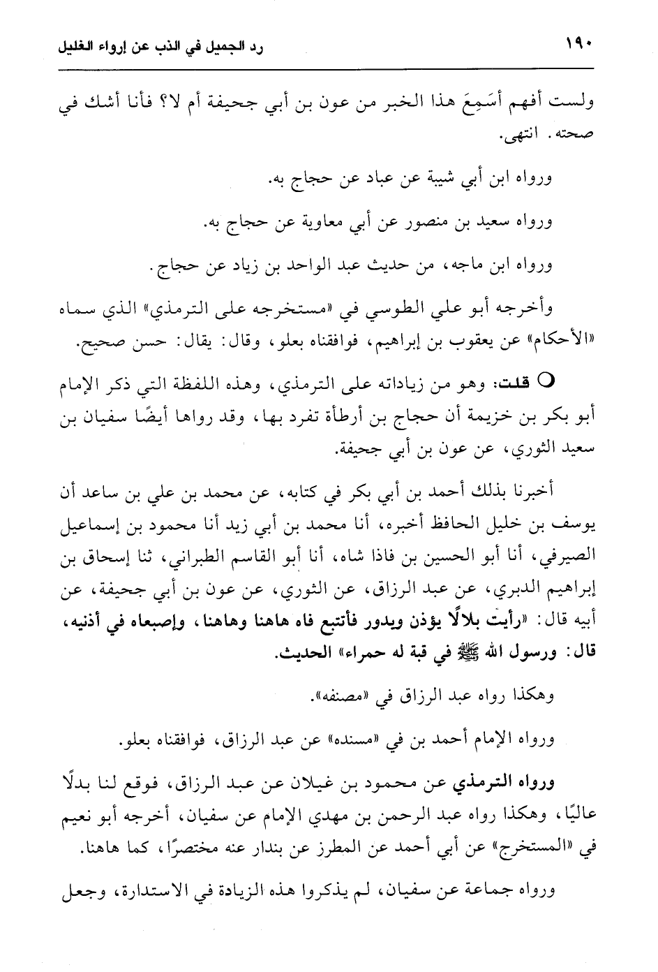 أخبرنا بذلك أحمد بن أبي بكر في كتابه، عن محمد بن علي بن ساعد أن يوسف بن خليل الحافظ أخبره، أنا محمد بن أبي زيد أنا محمود بن إسماعيل الصيرفي، أنا أبو الحسين بن فإذا شاه، أنا أبو القاسم الطبراني، ثنا إسحاق بن إبراهيم الدبري، عن عبد الرزاق، عن الثوري، عن عون بن أبي جحيفة، عن أبيه قال: "رأيت بلالاً يؤذن ويدور فأتتبع فاه هاهنا وهاهنا، وإصبعاه في أذنيه، قال: ورسول الله - صلى الله عليه وسلم - في قبة له حمراء" الحديث.