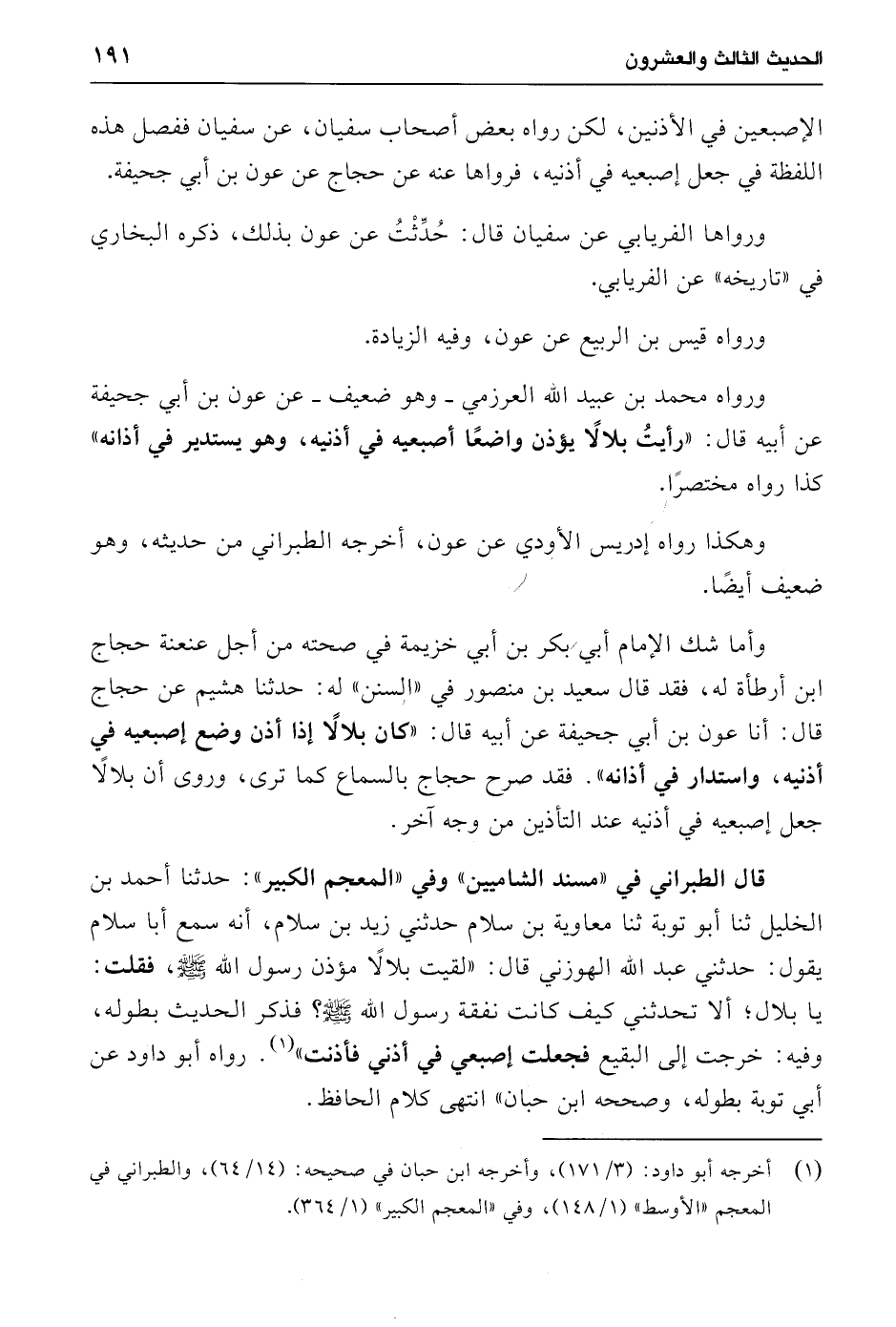 ورواه محمد بن عبيد الله العرزمي -وهو ضعيف- عن عون بن أبي جحيفة عن أبيه قال: "رأيت بلالاً يؤذن واضعًا أصبعيه في أذنيه، وهو يستدير في أذانه" كذا رواه مختصرًا.