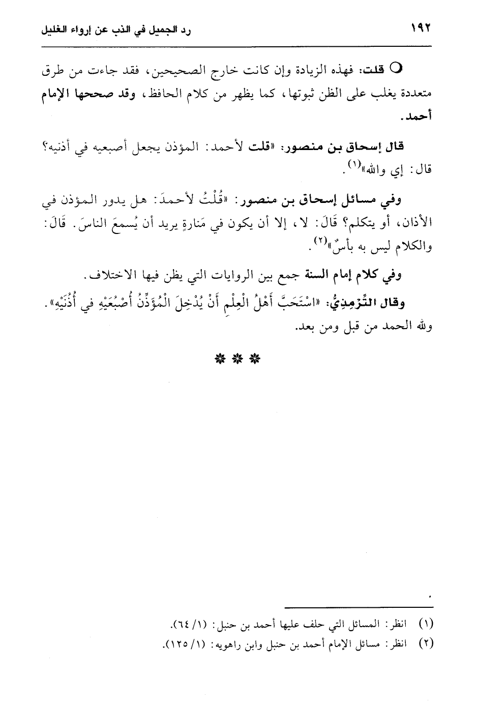 وقال التِّزمِذِيُّ: "اسْتَحَبَّ أَهْلُ الْعِلْمِ أَنْ يُدْخِلَ الْمُؤَذِّنُ أُصْبُعَيْهِ في أُذُنَيْهِ". ولله الحمد من قبل ومن بعد.
