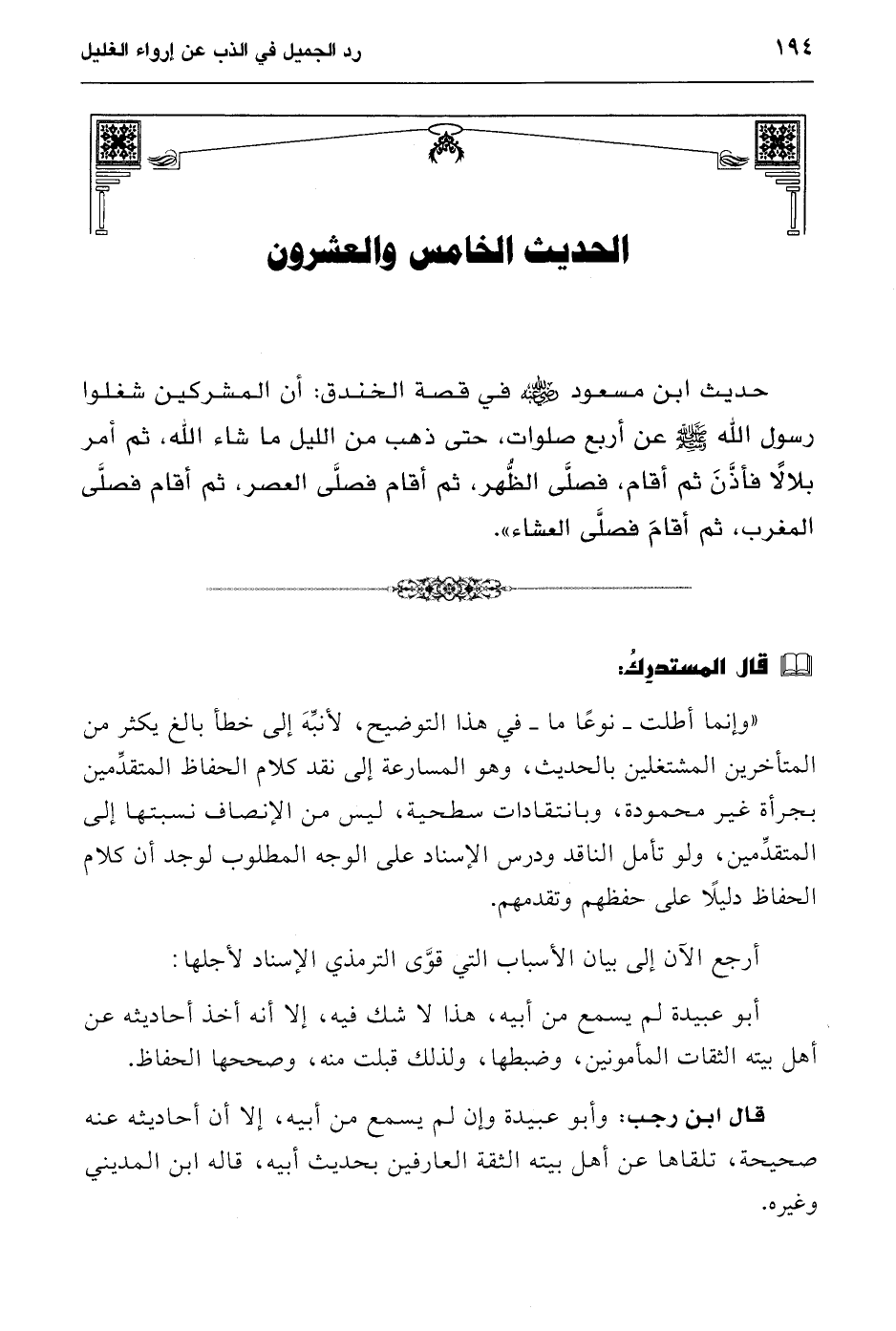 "وإنما أطلت -نوعًا ما- في هذا التوضيح، لأنبِّهَ إلى خطأ بالغ يكثر من المتأخرين المشتغلين بالحديث، وهو المسارعة إلى نقد كلام الحفاظ المتقدِّمين بجرأة غير محمودة، وبانتقادات سطحية، ليس من الإنصاف نسبتها إلى المتقدِّمين، ولو تأمل الناقد ودرس الإسناد على الوجه المطلوب لوجد أن كلام الحفاظ دليلاً على حفظهم وتقدمهم.