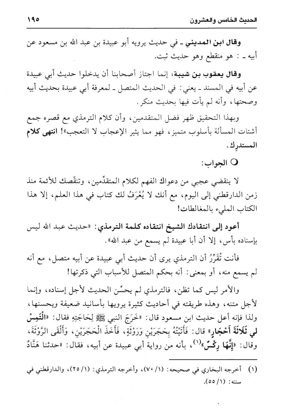 أعود إلى انتقادك الشيخ انتقاده كلمة الترمذي: "حديث عبد الله ليس بإسناده بأس، إلا أن أبا عبيدة لم يسمع من عبد الله".