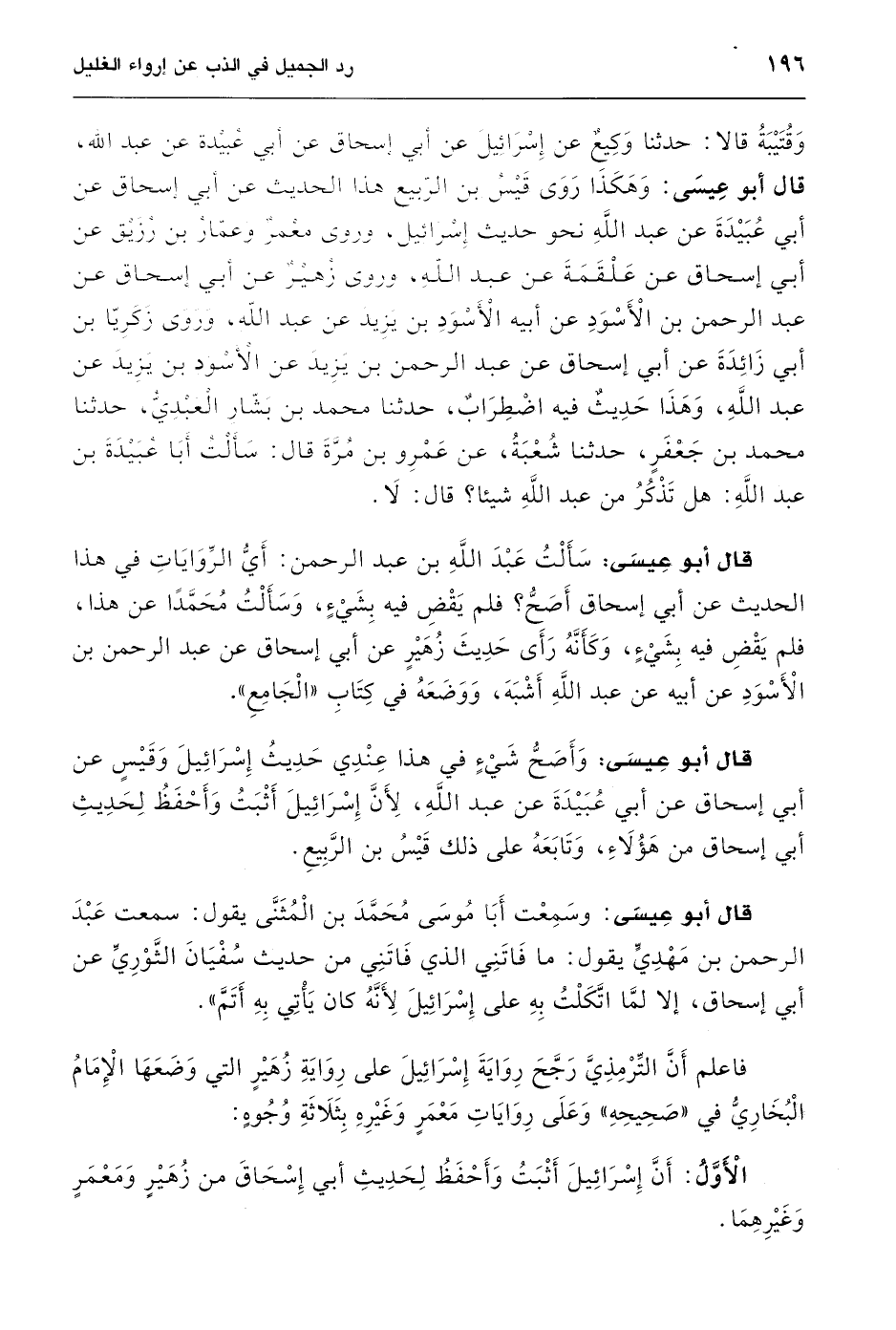 قال أبو عِيسَى: وَأَصَحُّ شَىءٍ في هذا عِنْدِي حَدِيثُ إِسرَائِيلَ وَقَيْسٍ عن أبي إسحاق عن أبي عُبَيْدَةَ عن عبد الله، لأَنَّ إِسرَائِيلَ أَثْبَتُ وَأَحْفَظُ لِحَدِيثِ أبِي إسحاق من هَؤُلاءِ، وَتَابَعَهُ على ذلك قَيْسُ بن الرَّبِيعِ.