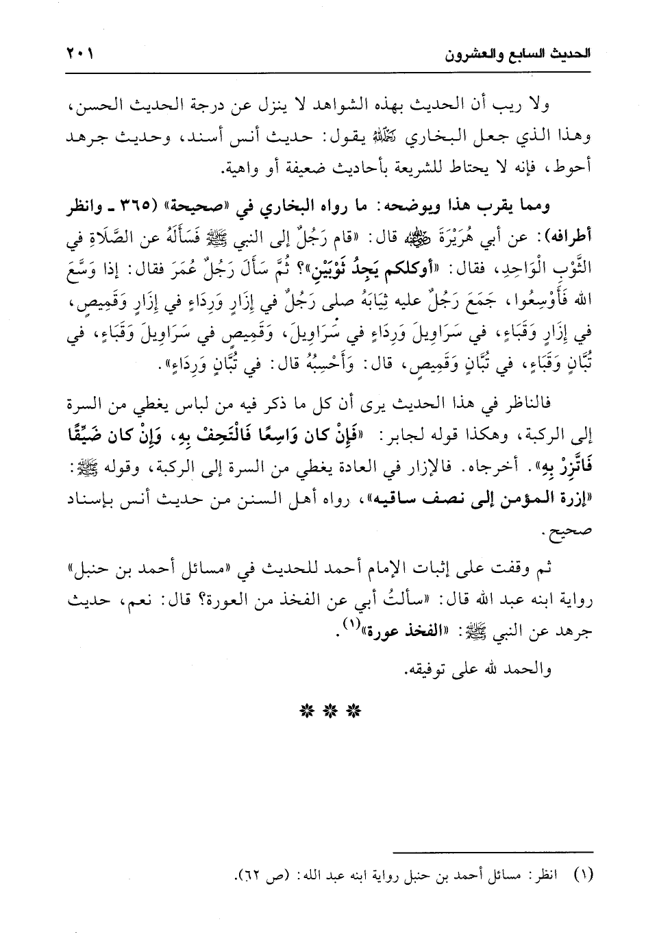 فالناظر في هذا الحديث يرى أن كل ما ذكر فيه من لباس يغطي من السرة إلى الركبة، وهكذا قوله لجابر: "فَإِنْ كان وَاسِعًا فَالْتَحِفْ بِهِ، وَإِنْ كان ضَيِّقًا فَاتَّزِرْ بِهِ". أخرجاه. فالإزار في العادة يغطي من السرة إلى الركبة، وقوله - صلى الله عليه وسلم -: "إزرة المؤمن إلى نصف ساقيه"، رواه أهل السنن من حديث أنس بإسناد صحيح.