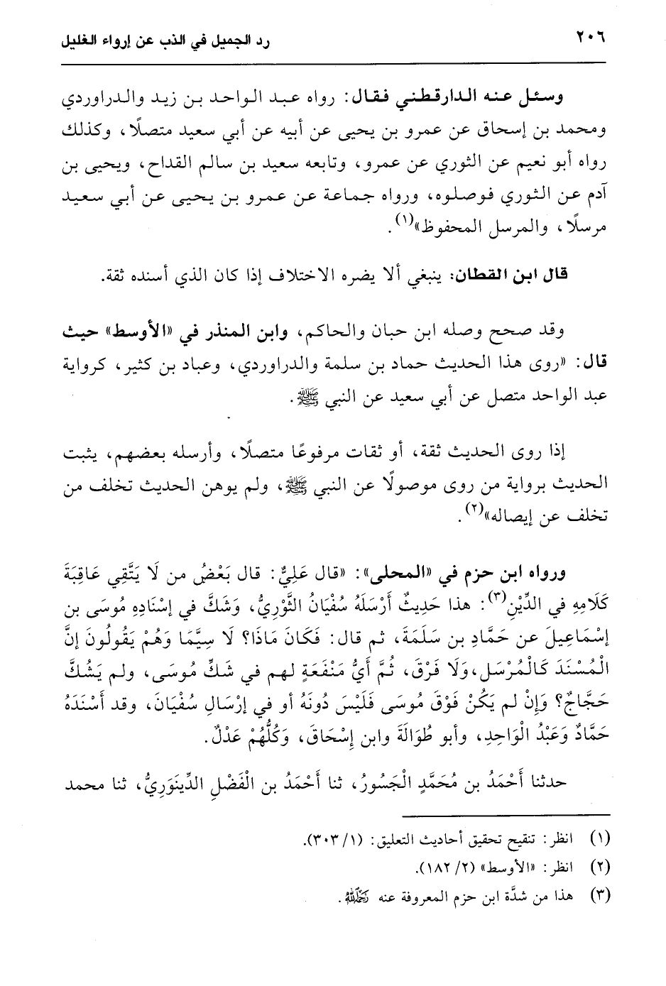 ورواه ابن حزم في "المحلى": "قال عَلِيٌّ: قال بعض من لا يَتَّقِي عَاقِبَةَ كَلامِهِ في الدِّيْنِ (¬3): هذا حَدِيث أَرْسَلَهُ سُفْيَانُ الثَّوْرِيُّ، وَشَكَّ في إسناده مُوسَى بن إسْمَاعِيلَ عن حَمَّادِ بن سَلَمَةَ، ثم قال: فَكَانَ مَاذَا؟ لا سِيَّمَا وَهُمْ يَقُولُونَ إنَّ الْمُسْنَدَ كَالْمُرْسَل، وَلا فرق، ثُمَّ أَيُّ مَنْفَعَةٍ لهم في شَكِّ مُوسَى، ولم يَشُكَّ حَجَّاجٌ؟ وَإِنْ لم يَكُنْ فوق مُوسَى فَلَيْسَ دُونَهُ أو في إرْسَالِ سُفْيَانَ، وقد أَسْنَدَهُ حَمَّادٌ وَعَبْدُ الْوَاحِدِ، وأبو طُوَالَةَ وابن إِسْحَاق، وَكُلُّهُمْ عَدْلٌ.
