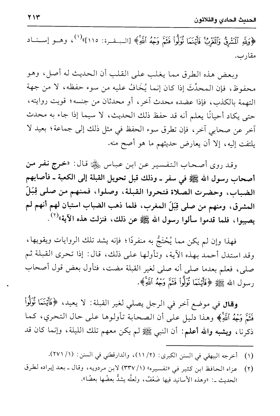 فهذا وإن لم يكن مما يُحْتَجُّ به منفردًا؛ فإنه يشد تلك الروايات ويقويها، وقد استدل أحمد بهذه الآية، وتأولها على ذلك، قال: إذا تحرى القبلة ثم صلى، فعلم بعدما صلى أنه صلى لغير القبلة مضت، فتأول بعض قول أصحاب رسول الله - صلى الله عليه وسلم - (فَأَينَمَا تُوَلُّواْ فَثَمَّ وَجْهُ اَللَّهِ).