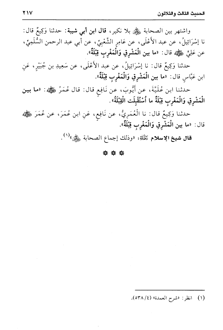 واشتهر بين الصحابة - رضي الله عنه - بلا نكير، قال ابن أبي شيبة: حدثنا وَكِيعٌ قال: نا إسْرَائيل، عن عبد الأعْلَى، عن عامر الشِّعْبِيِّ، عن أبي عبد الرحمن السُّلمِيِّ، عن عَلِيٍّ - رضي الله عنه - قال: "ما بين الْمَشْرِق وَالْمَغْربِ قِبْلَةٌ".