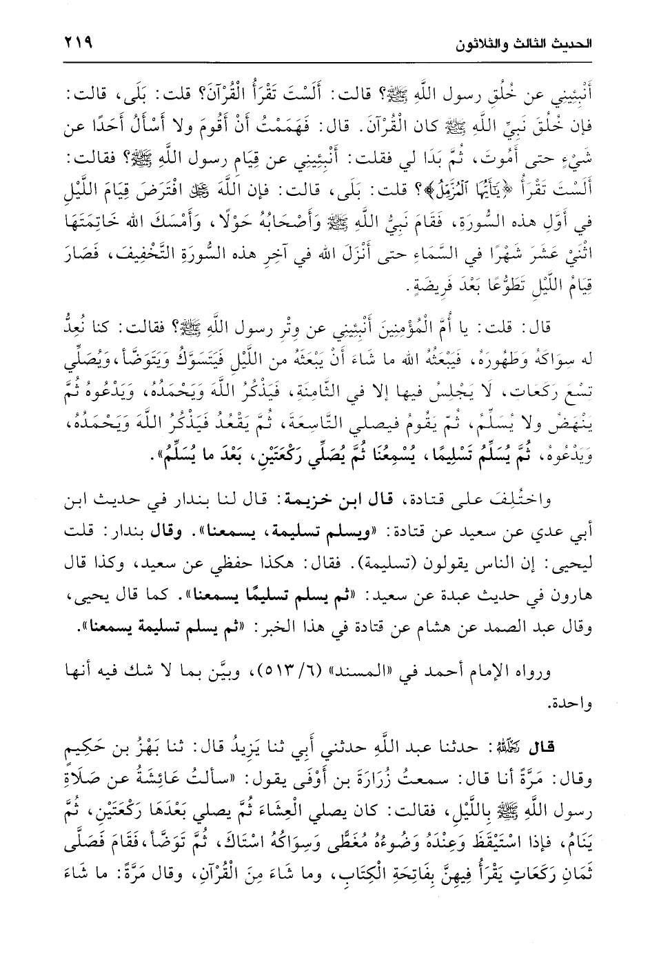 قال رحمه الله: حدثنا عبد اللَّهِ حدثني أَبِي ثنا يَزِيدُ قال: ثنا بَهْزُ بن حَكِيمٍ وقال: مَرَّةً أنا قال: سمعتُ زُرَارَةَ بن أَوْفَى يقول: "سألتُ عَائِشَةُ عن صَلاةِ رسول اللَّهِ - صلى الله عليه وسلم - بِالليْلِ، فقالت: كان يصلي الْعِشَاءَ ثُم يصلي بَعْدَهَا رَكْعَتَيْنِ، ثُم يَنَامُ، فإذا اسْتَيْقَظَ وَعِنْدَهُ وَضُوءُهُ مُغَطًّى وَسِوَاكُهُ اسْتَاكَ، ثُمَّ تَوَضَّأ، فَقَامَ فَصَلَّى ثَمَانِ رَكَعَاتٍ يَقْرَأُ فِيهِنَّ بِفَاتِحَةِ الْكِتَابِ، وما شَاءَ مِنَ الْقُرْآنِ، وقال مَرَّةً: ما شَاءَ