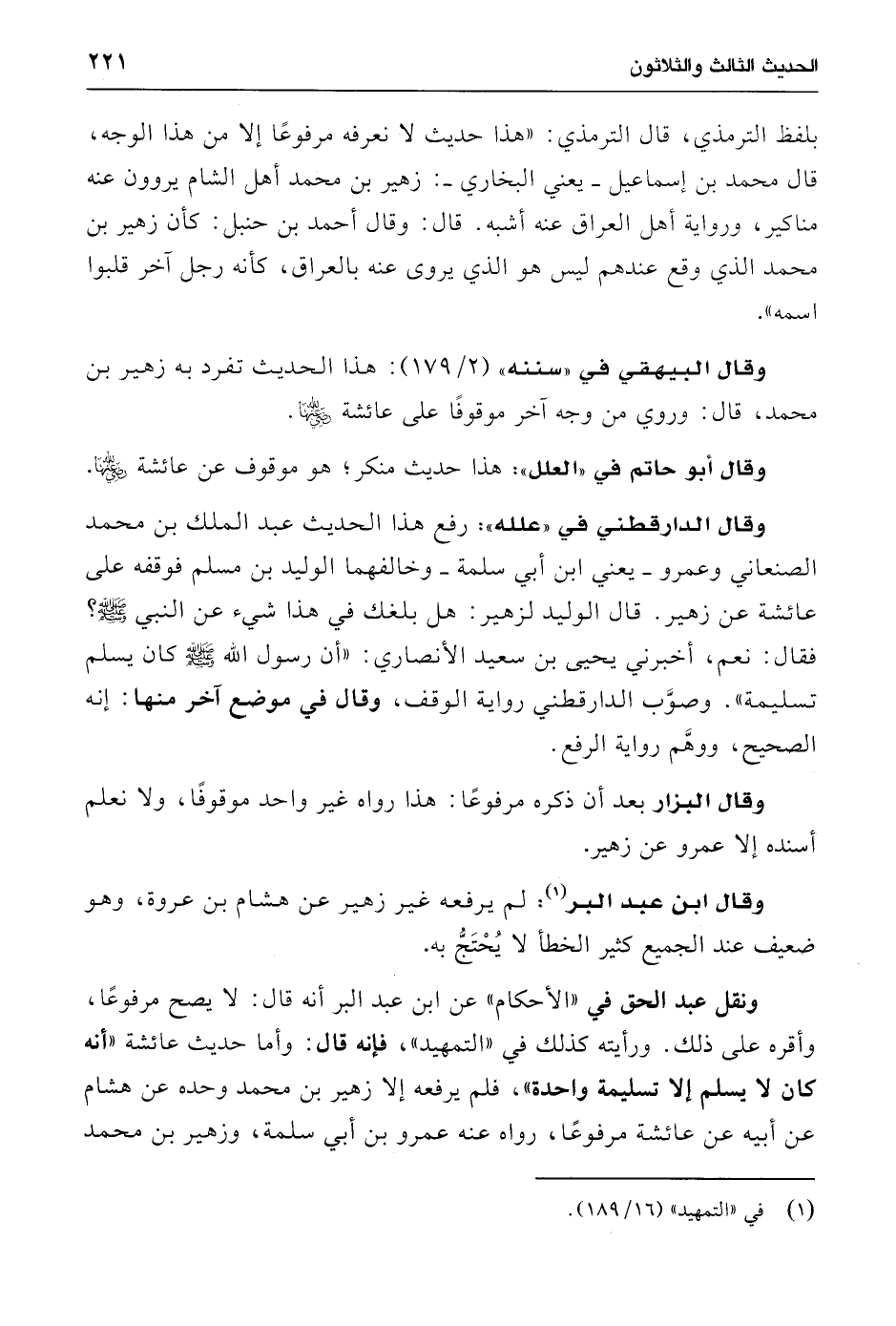 ونقل عبد الحق في "الأحكام" عن ابن عبد البر أنه قال: لا يصح مرفوعًا، وأقره على ذلك. ورأيته كذلك في "التمهيد"، فإنه قال: وأما حديث عائشة "أنه كان لا يسلم إلا تسليمة واحدة"، فلم يرفعه إلا زهير بن محمد وحده عن هشام عن أبيه عن عائشة مرفوعًا، رواه عنه عمرو بن أبي سلمة، وزهير بن محمد