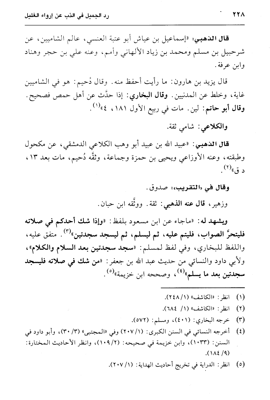 ويشهد له: "ما جاء عن ابن مسعود بلفظ: "وإذا شك أحدكم في صلاته فليتحرَّ الصواب، فليتم عليه، ثم ليسلم، ثم ليسجد سجدتين" (¬3). متفق عليه، واللفظ للبخاري، وفي لفظ لمسلم: "سجد سجدتين بعد السلام والكلام"، ولأبي داود والنسائي من حديث عبد الله بن جعفر: "من شك في صلاته فليسجد سجدتين بعد ما يسلم" (¬4)، وصححه ابن خزيمة" (¬5).