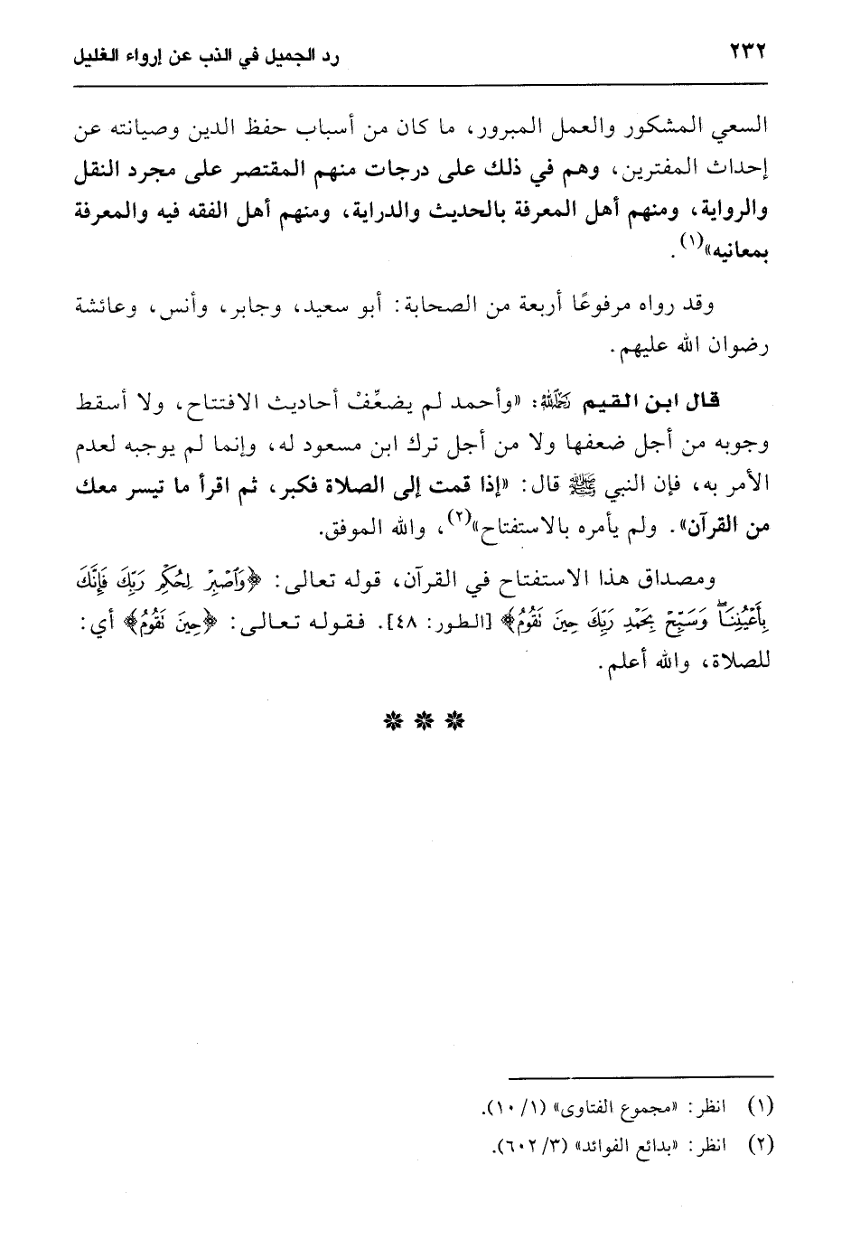 قال ابن القيم رحمه الله: "وأحمد لم يضعِّف أحاديث الافتتاح، ولا أسقط وجوبه من أجل ضعفها ولا من أجل ترك ابن مسعود له، وإنما لم يوجبه لعدم الأمر به، فإن النبي - صلى الله عليه وسلم - قال: "إذا قمت إلى الصلاة فكبر، ثم اقرأ ما تيسر معك من القرآن". ولم يأمره بالاستفتاح" (¬2)، والله الموفق.