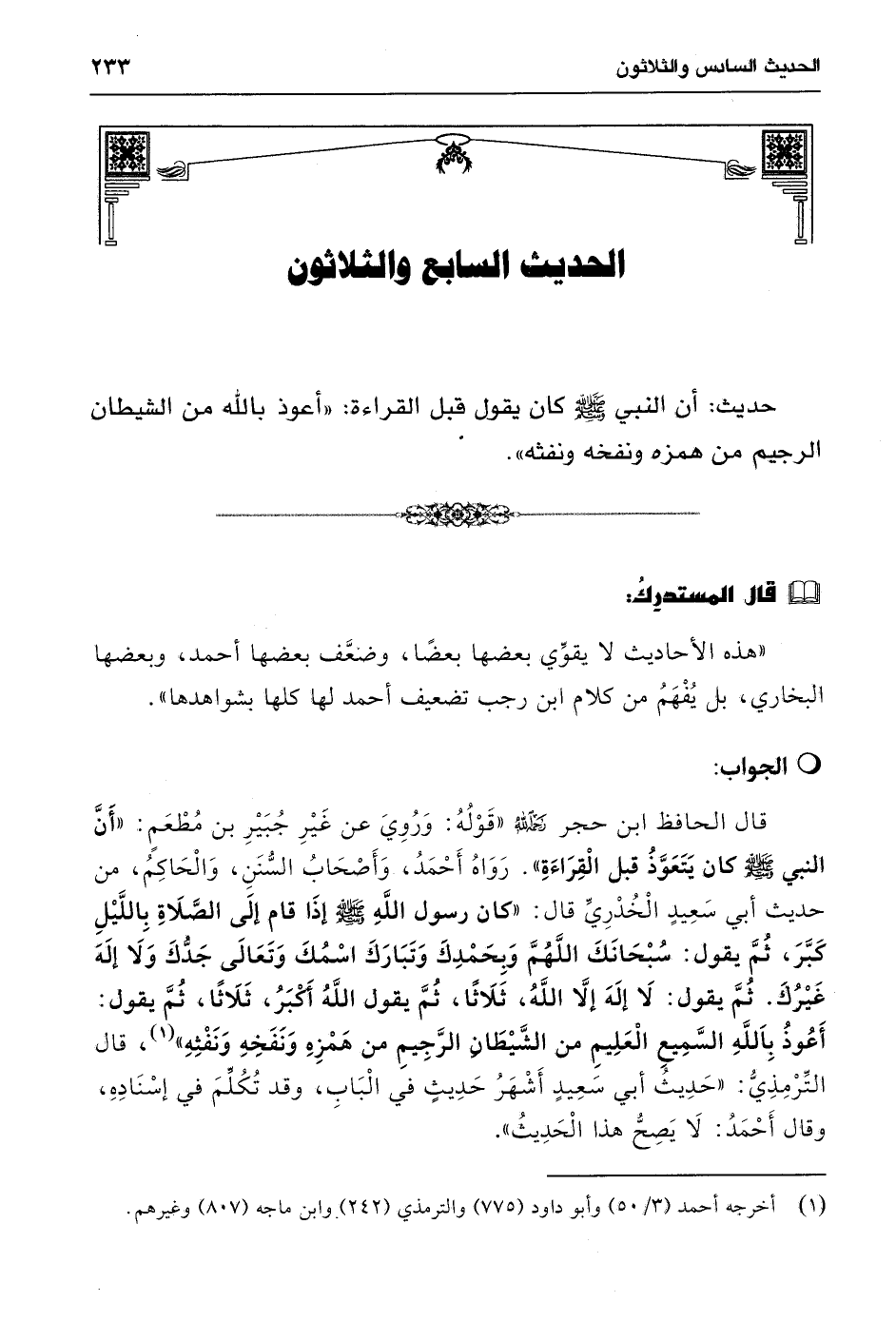 قال الحافظ ابن حجر رحمه الله "قَوْلُهُ: وَرُوِيَ عن غَيْرِ جُبَيْرِ بن مُطْعَمٍ: "أَنَّ النبي - صلى الله عليه وسلم - كان يَتَعَوَّذُ قبل الْقِرَاءَةِ". رَوَاهُ أَحْمَدُ، وَأَصحَابُ السُّنَنِ، وَالْحَاكِمُ، من حديث أبي سَعِيدٍ الْخُدْرِيِّ قال: "كان رسول اللَّهِ - صلى الله عليه وسلم - إذَا قام إلَى الصَّلاةِ بِاللَّيْلِ كَبَّرَ، ثُمَّ يقول: سُبْحَانَكَ اللهم وَبِحَمْدِكَ وَتَبَارَكَ اسْمُكَ وَتَعَالَى جَدُّكَ وَلا إلَهَ غَيْرُكَ. ثُمَّ يقول: لا إلَهَ إلاَّ اللَّهُ، ثَلاثًا، ثُمَّ يقول اللَّهُ أَكْبَرُ، ثَلاثًا، ثُمَّ يقول: أَعُوذُ بِاللَّهِ السَّمِيعِ الْعَلِيمِ من الشَّيْطَان الرَّجِيمِ من هَمْزِهِ وَنَفَخِهِ وَنَفْثِهِ" (¬1)، قال التِّرْمِذِيُّ: "حَدِيثُ أبي سَعِيدٍ أَشْهَرُ حَدِيثٍ في الْبَابِ، وقد تُكُلِّمَ في إسناده، وقال أَحْمَدُ: لا يَصحُّ هذا الْحَدِيثُ".