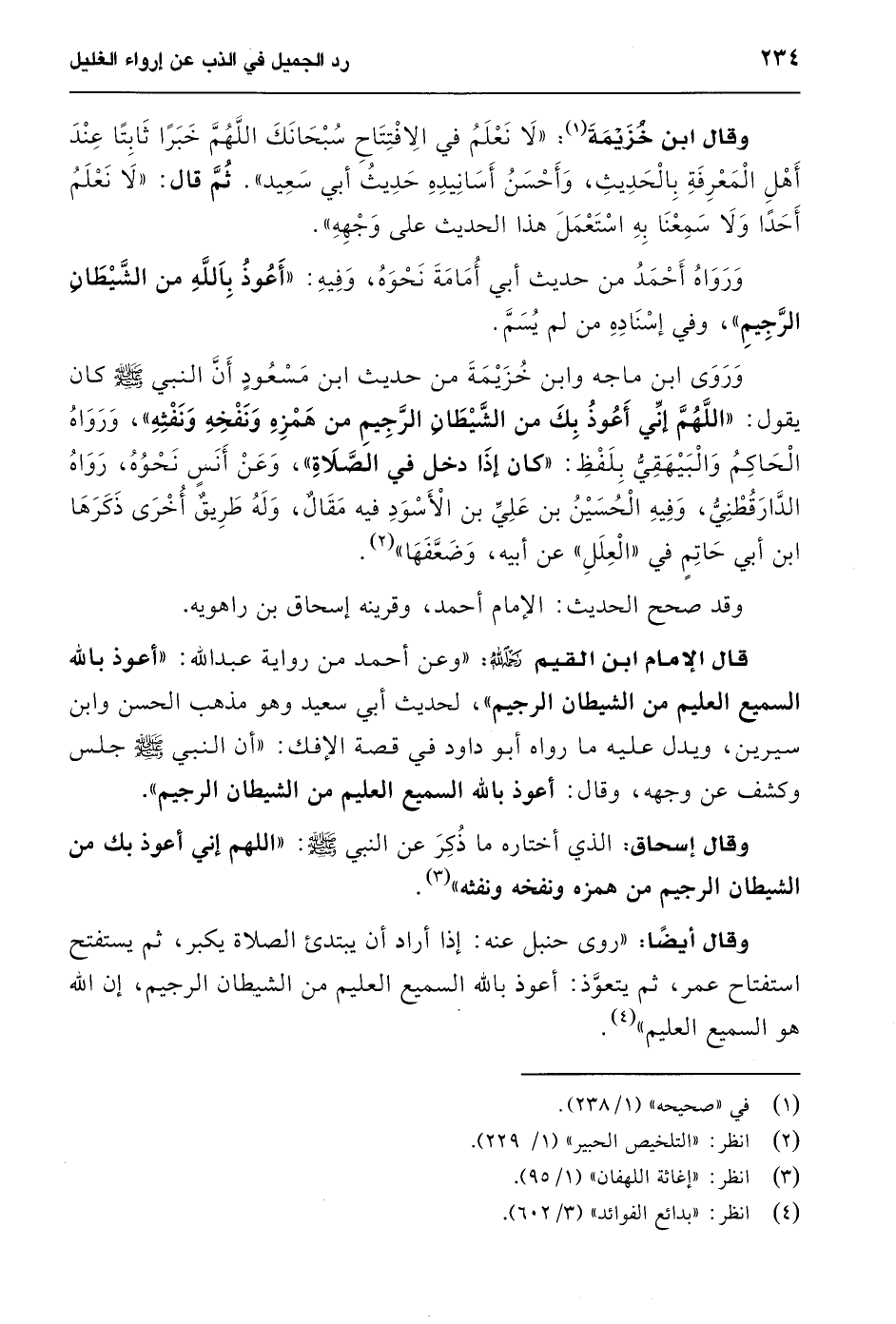 قال الإمام ابن القيم رحمه الله: "وعن أحمد من رواية عبد الله: "أعوذ بالله السميع العليم من الشيطان الرجيم"، لحديث أبي سعيد وهو مذهب الحسن وابن سيرين، ويدل عليه ما رواه أبو داود في قصة الإفك: "أن النبي - صلى الله عليه وسلم - جلس وكشف عن وجهه، وقال: أعوذ بالله السميع العليم من الشيطان الرجيم".