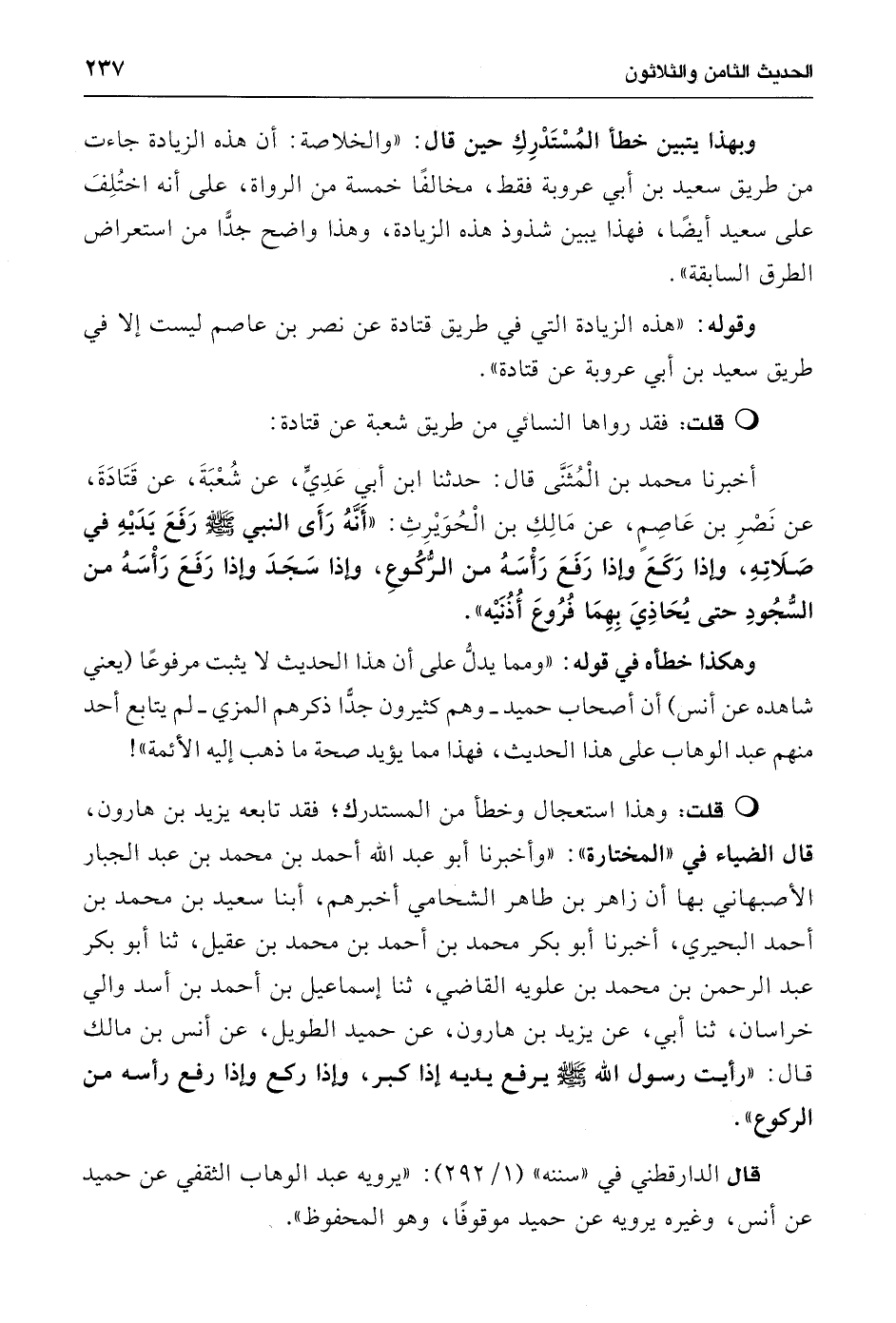 * قلت: وهذا استعجال وخطأ من المستدرك؛ فقد تابعه يزيد بن هارون، قال الضياء في "المختارة": "وأخبرنا أبو عبد الله أحمد بن محمد بن عبد الجبار الأصبهاني بها أن زاهر بن طاهر الشحامي أخبرهم، أبنا سعيد بن محمد بن أحمد البحيري، أخبرنا أبو بكر محمد بن أحمد بن محمد بن عقيل، ثنا أبو بكر عبد الرحمن بن محمد بن علويه القاضي، ثنا إسماعيل بن أحمد بن أسد والي خراسان، ثنا أبي، عن يزيد بن هارون، عن حميد الطويل، عن أنس بن مالك قال: "رأيت رسول الله - صلى الله عليه وسلم - يرفع يديه إذا كبر، وإذا ركع وإذا رفع رأسه من الركوع".