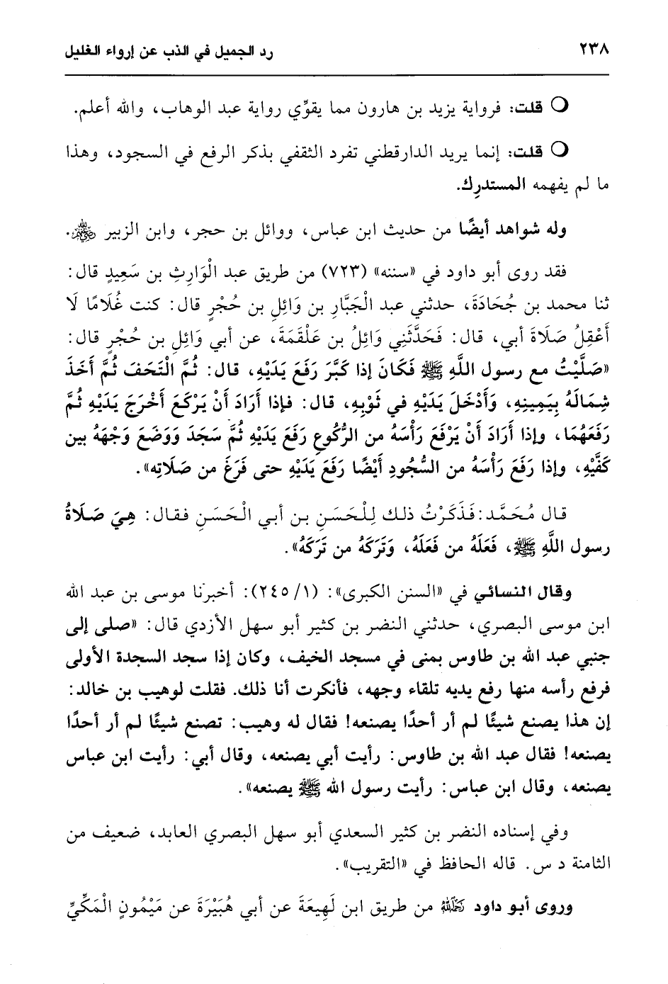 وقال النسائي في "السنن الكبرى": (1/ 245): أخبرنا موسى بن عبد الله ابن موسى البصري، حدثني النضر بن كثير أبو سهل الأزدي قال: "صلى إلى جنبي عبد الله بن طاوس بمنى في مسجد الخيف، وكان إذا سجد السجدة الأولى فرفع رأسه منها رفع يديه تلقاء وجهه، فأنكرت أنا ذلك. فقلت لوهيب بن خالد: إن هذا يصنع شيئًا لم أر أحدًا يصنعه! فقال له وهيب: تصنع شيئًا لم أر أحدًا يصنعه! فقال عبد الله بن طاوس: رأيت أبي يصنعه، وقال أبي: رأيت ابن عباس يصنعه، وقال ابن عباس: رأيت رسول الله - صلى الله عليه وسلم - يصنعه".