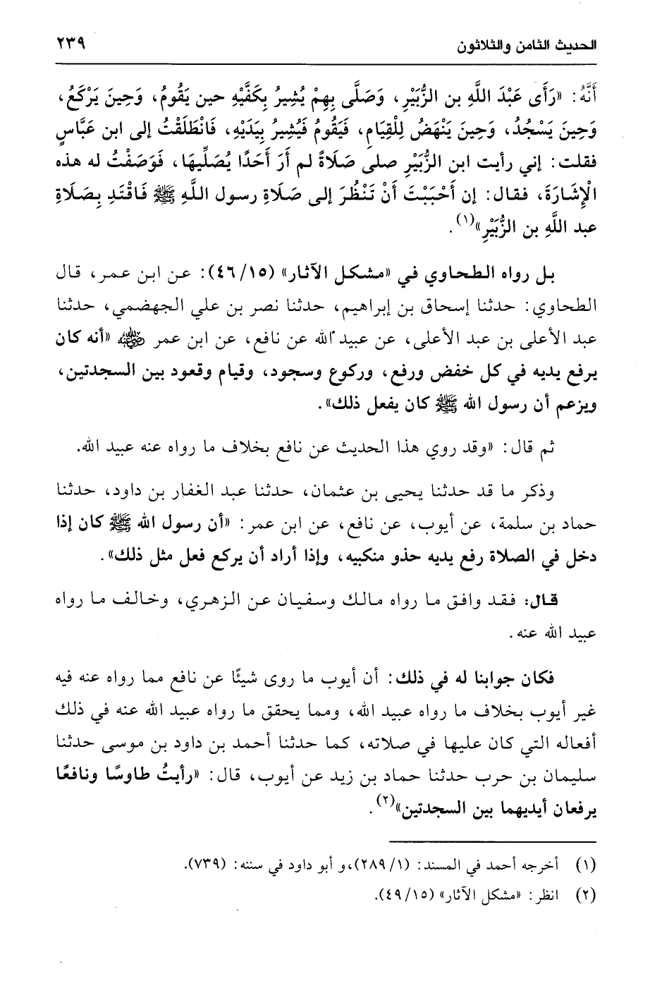 فكان جوابنا له في ذلك: أن أيوب ما روى شيئًا عن نافع مما رواه عنه فيه غير أيوب بخلاف ما رواه عبيد الله، ومما يحقق ما رواه عبيد الله عنه في ذلك أفعاله التي كان عليها في صلاته، كما حدثنا أحمد بن داود بن موسى حدثنا سليمان بن حرب حدثنا حماد بن زيد عن أيوب، قال: "رأيتُ طاوسًا ونافعًا يرفعان أيديهما بين السجدتين" (¬2).