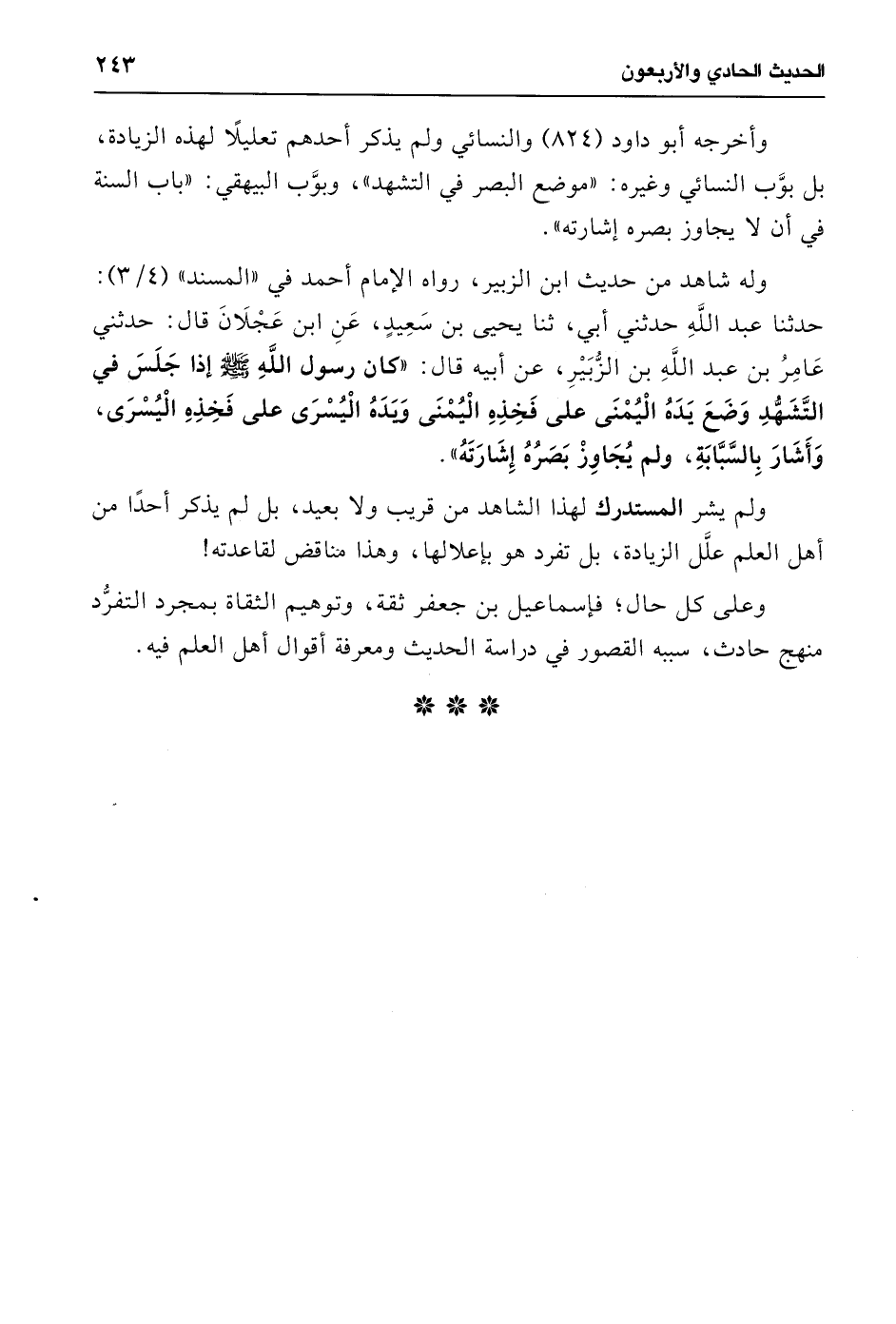 حدثنا عبد اللَّهِ حدثني أبي، ثنا يحيى بن سَعِيدٍ، عَنِ ابن عَجْلانَ قال: حدثني عَامِرُ بن عبد اللَّهِ بن الزُّبَيْرِ، عن أبيه قال: "كان رسول اللَّهِ - صلى الله عليه وسلم - إذا جَلَسَ في التَّشَهُّدِ وَضَعَ يَدَهُ الْيُمْنَى على فَخِذِهِ الْيُمْنَى وَيَدَهُ الْيُسْرَى على فَخِذهِ الْيُسْرَى، وَأَشَارَ بِالسَّبَّابَةِ، ولم يُجَاوِزْ بَصَرُهُ إِشَارَتَهُ".