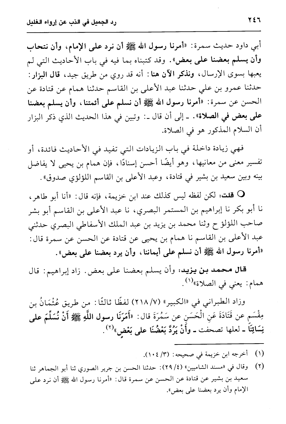 قال محمد بن يزيد: وأن يسلم بعضنا على بعض. زاد إبراهيم: قال همام: يعني في الصلاة" (¬1).