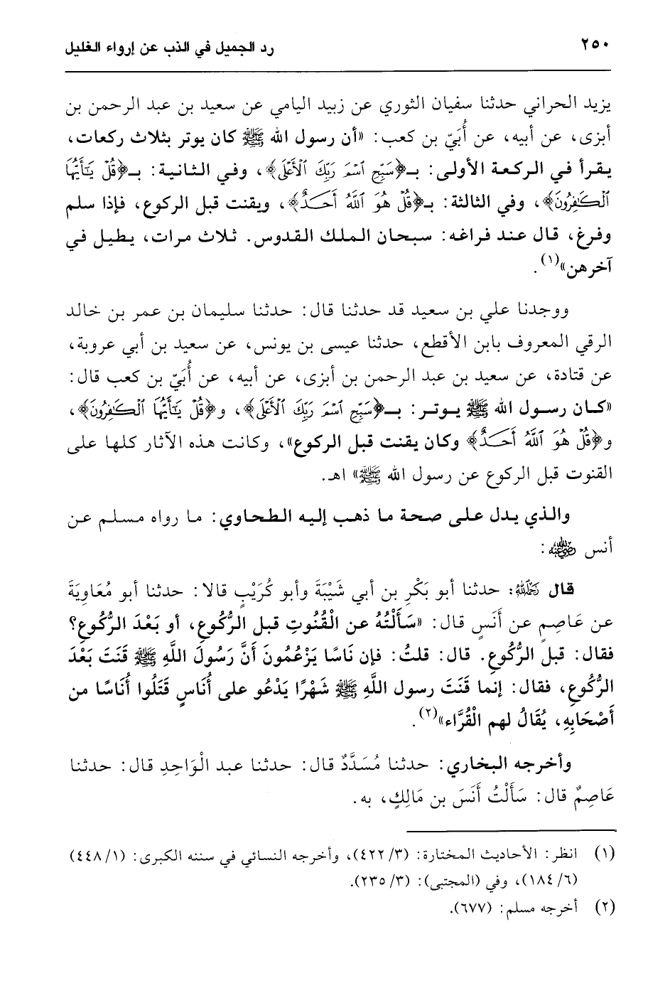 قال رحمه الله: حدثنا أبو بَكْرِ بن أبي شَيْبَةَ وأبو كُرَيْبِ قالا: حدثنا أبو مُعَاوِيَةَ عن عَاصِمِ عن أَنَسٍ قال: "سَأَلْتُهُ عن الْقُنُوتِ قبل اَلرُّكُوعِ، أو بَعْدَ الرُّكُوعِ؟ فقال: قبلَ الرُّكُوعِ. قال: قلتُ: فإن نَاسًا يَزْعُمُونَ أَنَّ رَسُولَ اللَّهِ - صلى الله عليه وسلم - قَنَتَ بَعْدَ الرُّكُوعِ، فقال: إنما قَنَتَ رسول اللَّهِ - صلى الله عليه وسلم - شَهْرًا يَدْعُو على أُنَاس قَتَلُوا أُنَاسًا من أَصْحَابِهِ، يُقَالُ لهم الْقُرَّاء" (¬2).