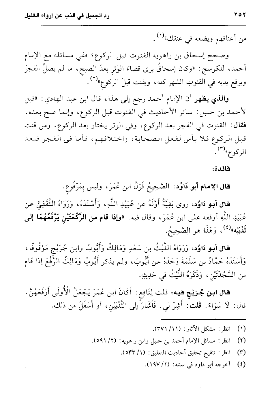 والذي يظهر أن الإمام أحمد رجع إلى هذا، قال ابن عبد الهادي: "قيل لأحمد بن حنبل: سائر الأحاديث في القنوت قبل الركوع، وإنما صح بعده. فقال: القنوت في الفجر بعد الركوع، وفي الوتر يختار بعد الركوع، ومن قنت قبل الركوع فلا بأس لفعل الصحابة، واختلافهم، فأما في الفجر فبعد الركوع" (¬3).
