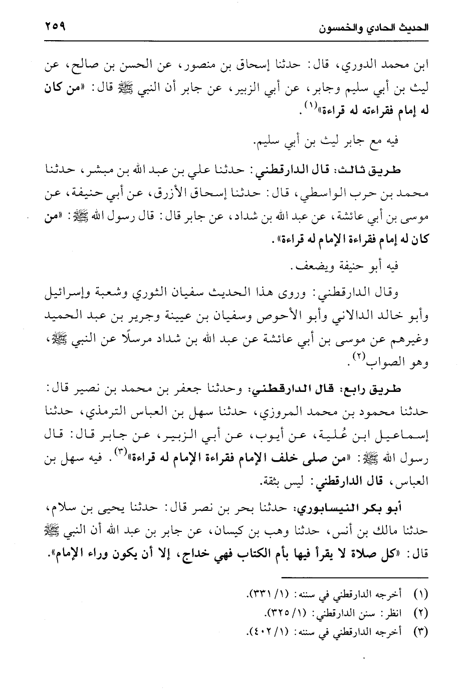 طريق ثالث: قال الدارقطني: حدثنا علي بن عبد الله بن مبشر، حدثنا محمد بن حرب الواسطي، قال: حدثنا إسحاق الأزرق، عن أبي حنيفة، عن موسى بن أبي عائشة، عن عبد الله بن شداد، عن جابر قال: قال رسول الله - صلى الله عليه وسلم -: "من كان له إمام فقراءة الإمام له قراءة".