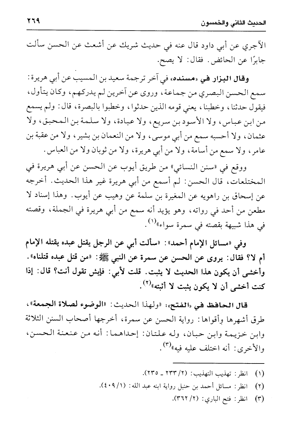 قال الحافظ في "الفتح": "ولهذا الحديث: "الوضوء لصلاة الجمعة"، طرق أشهرها وأقواها: رواية الحسن عن سمرة، أخرجها أصحاب السنن الثلاثة وابن خزيمة وابن حبان، وله علتان: إحداهما: أنه من عنعنة الحسن، والأخرى: أنه اختلف عليه فيه" (¬3).