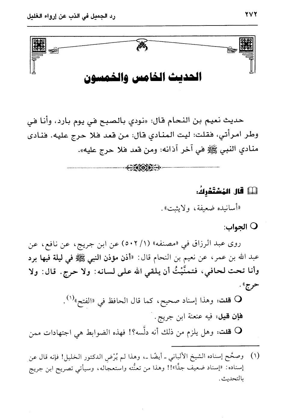 (¬1) وصحَّح إسناده الشيخ الألباني -أيضًا-، وهذا لم يُرْضِ الدكتور الخليل! فإنه قال عن إسناده: "إسناد ضعيف جدَّا"!! وهذا من تعنُّته واستعجاله، وسيأتي تصريح ابن جريج بالتحديث.