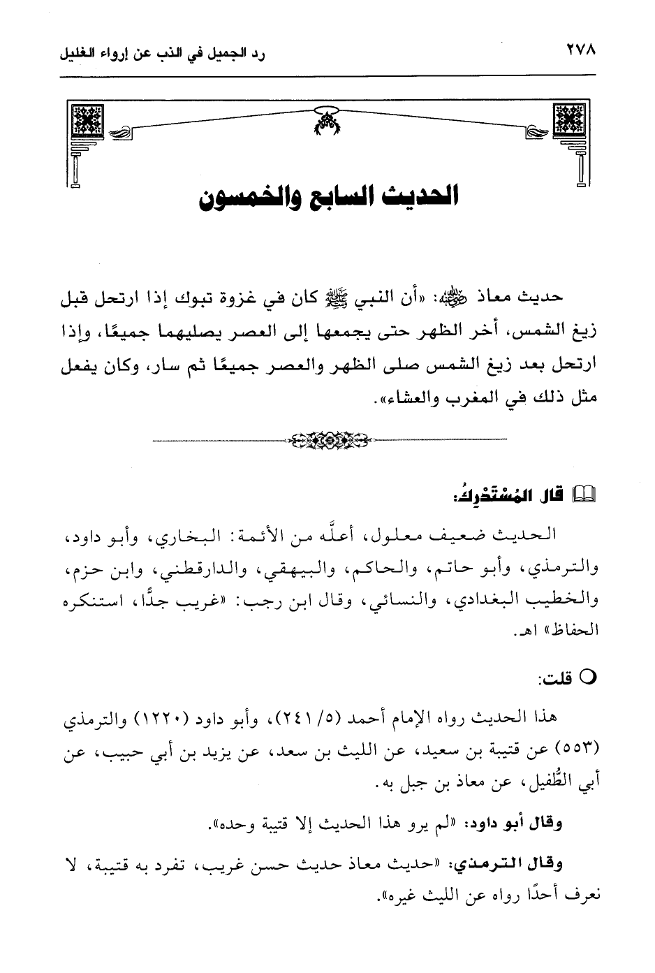 حديث معاذ -رضي الله عنه-: "أن النبي - صلى الله عليه وسلم - كان في غزوة تبوك إذا ارتحل قبل زيغ الشمس، أخر الظهر حتى يجمعها إلى العصر يصليهما جميعًا، وإذا ارتحل بعد زيغ الشمس صلى الظهر والعصر جميعًا ثم سار، وكان يفعل مثل ذلك في المغرب والعشاء".