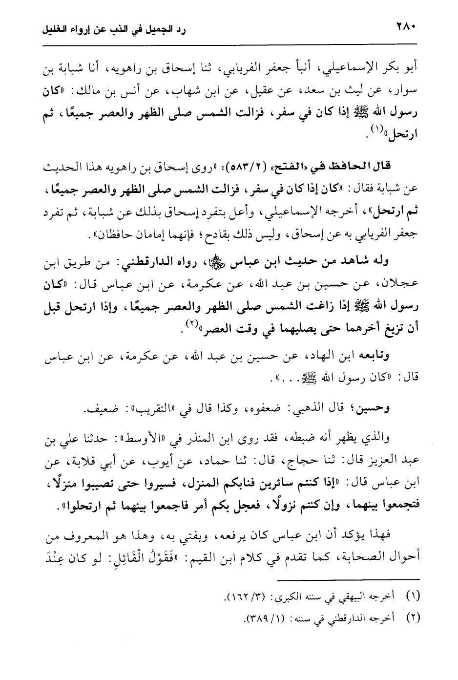 أبو بكر الإسماعيلي، أنبأ جعفر الفريابي، ثنا إسحاق بن راهويه، أنا شبابة بن سوار، عن ليث بن سعد، عن عقيل، عن ابن شهاب، عن أنس بن مالك: "كان رسول الله - صلى الله عليه وسلم - إذا كان في سفر، فزالت الشمس صلى الظهر والعصر جميعًا، ثم ارتحل" (¬1).