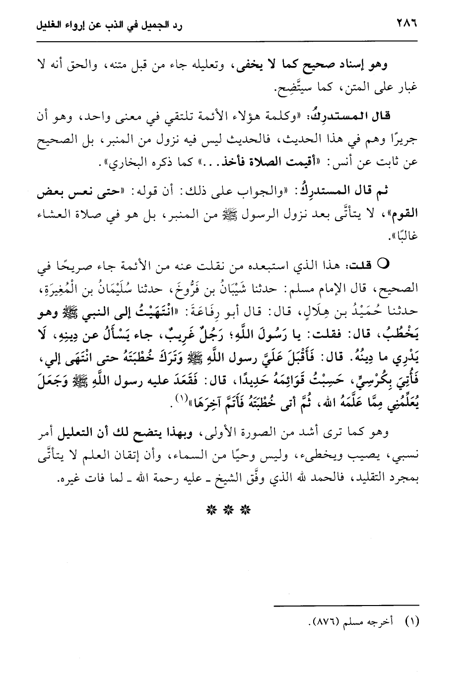 وهو كما ترى أشد من الصورة الأولى، وبهذا يتضح لك أن التعليل أمر نسبي، يصيب ويخطئ، وليس وحيًا من السماء، وأن إتقان العلم لا يتأتَّى بمجرد التقليد، فالحمد لله الذي وفَّق الشيخ -عليه رحمة الله- لما فات غيره.
