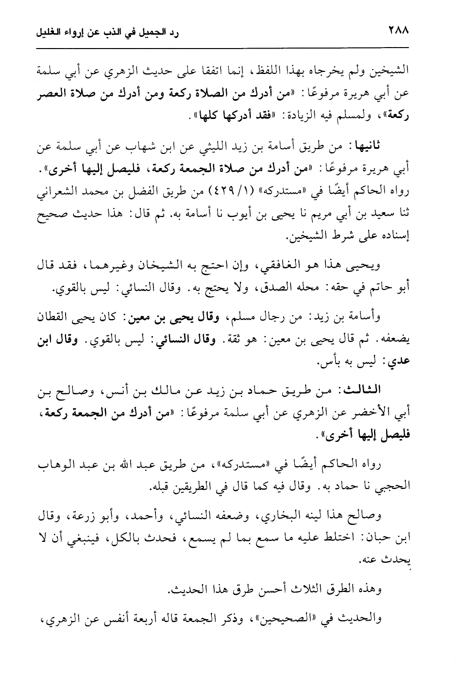 ثانيها: من طريق أسامة بن زيد الليثي عن ابن شهاب عن أبي سلمة عن أبي هريرة مرفوعًا: "من أدرك من صلاة الجمعة ركعة، فليصل إليها أخرى". رواه الحاكم أيضا في "مستدركه" (1/ 429) من طريق الفضل بن محمد الشعراني ثنا سعيد بن أبي مريم نا يحيى بن أيوب نا أسامة به. ثم قال: هذا حديث صحيح إسناده على شرط الشيخين.