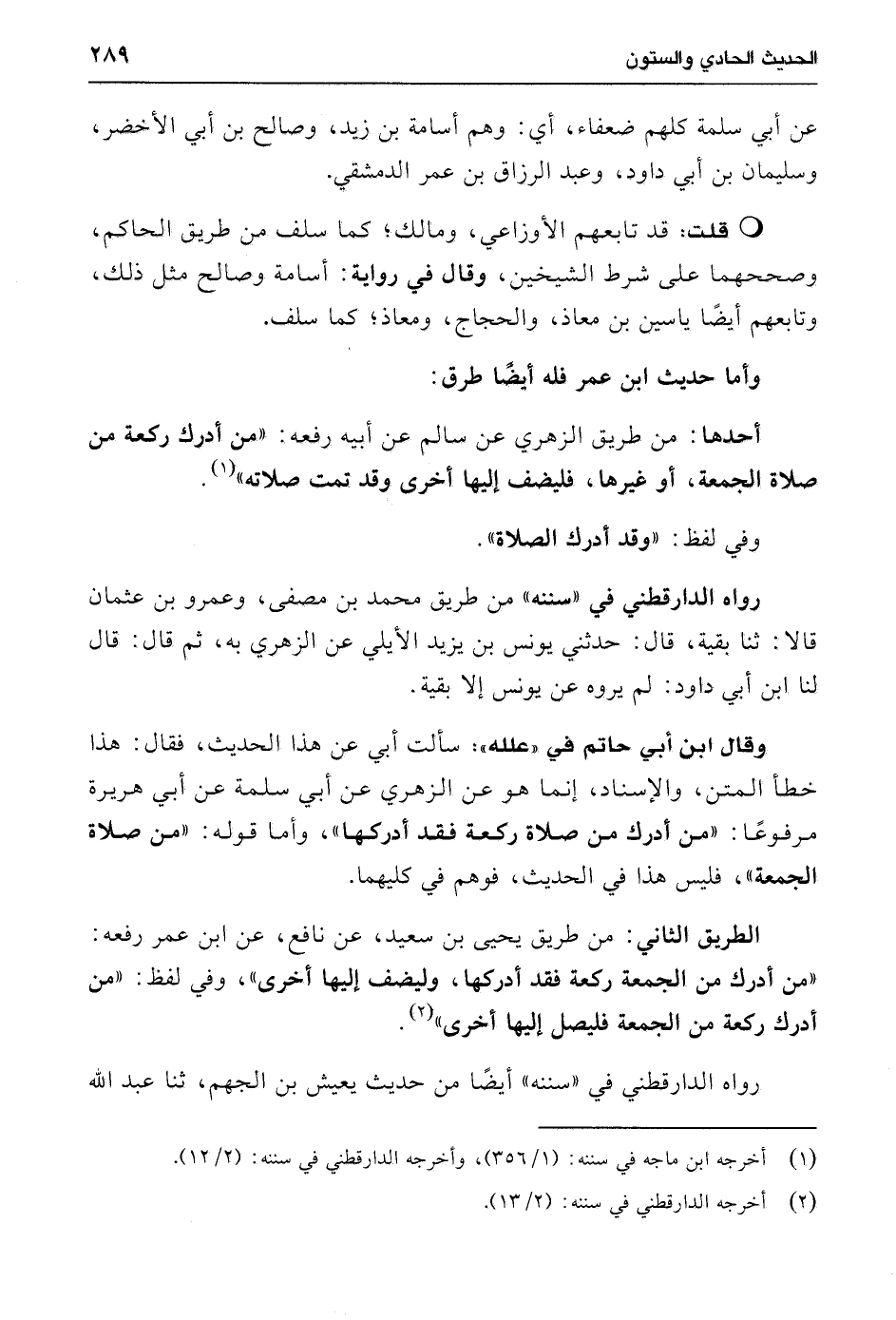 أحدها: من طريق الزهري عن سالم عن أبيه رفعه: "من أدرك ركعة من صلاة الجمعة، أو غيرها، فليضف إليها أخرى وقد تمت صلاته" (¬1).
