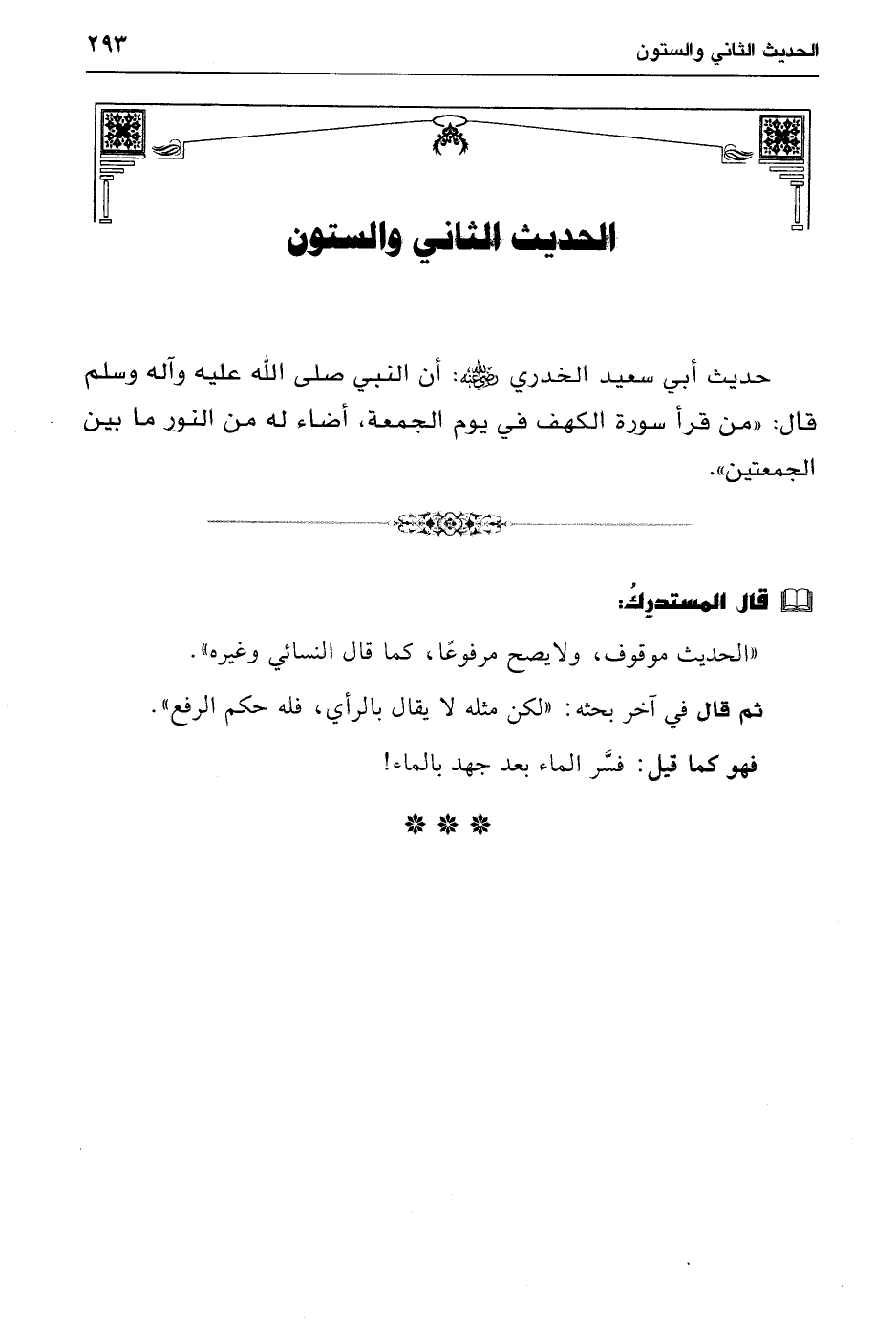 حديث أبي سعيد الخدري -رضي الله عنه-: أن النبي صلى الله عليه وآله وسلم قال: "من قرأ سورة الكهف في يوم الجمعة، أضاء له من النور ما بين الجمعتين".