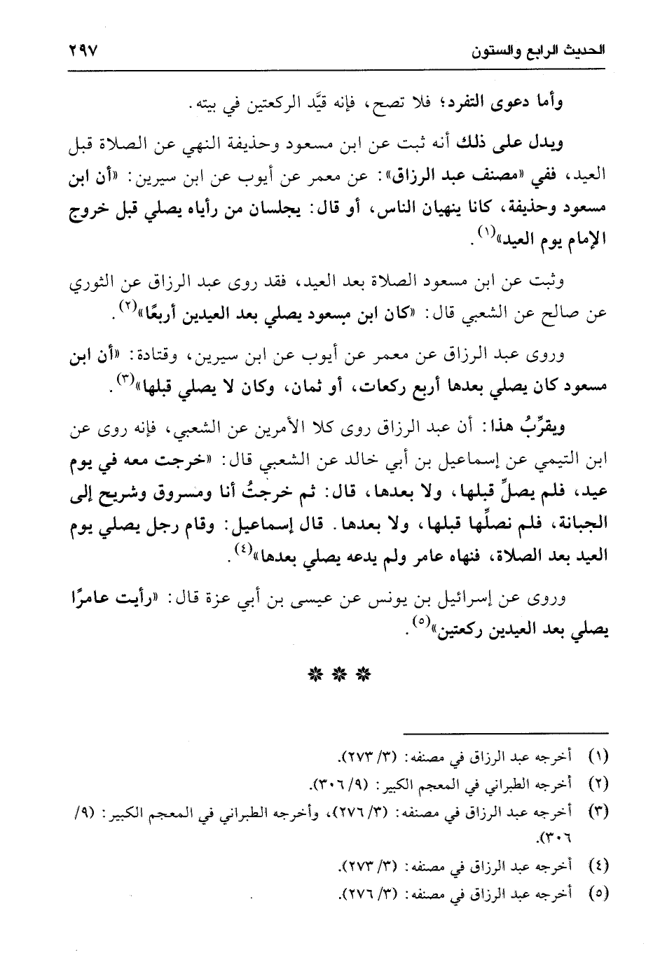 ويقرِّبُ هذا: أن عبد الرزاق روى كلا الأمرين عن الشعبي، فإنه روى عن ابن التيمي عن إسماعيل بن أبي خالد عن الشعبي قال: "خرجت معه في يوم عبد، فلم يصلِّ قبلها، ولا بعدها، قال: ثم خرجتُ أنا ومسروق وشريح إلى الجبانة، فلم نصلِّها قبلها، ولا بعدها. قال إسماعيل: وقام رجل يصلي يوم العيد بعد الصلاة، فنهاه عامر ولم يدعه يصلي بعدها" (¬4).