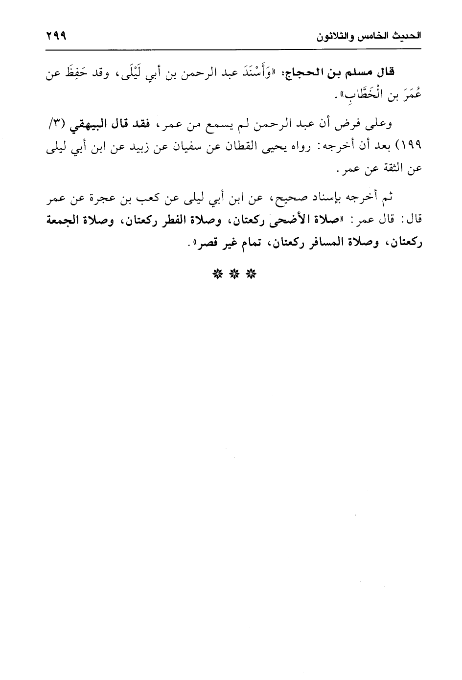 ثم أخرجه بإسناد صحيح، عن ابن أبي ليلى عن كعب بن عجرة عن عمر قال: قال عمر: "صلاة الأضحى ركعتان، وصلاة الفطر ركعتان، وصلاة الجمعة ركعتان، وصلاة المسافر ركعتان، تمام غير قصر".