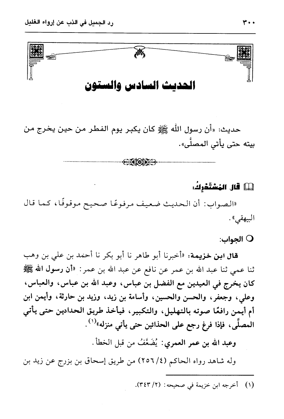 قال ابن خزيمة: "أخبرنا أبو طاهر نا أبو بكر نا أحمد بن علي بن وهب ثنا عمي ثنا عبد الله بن عمر عن نافع عن عبد الله بن عمر: "أن رسول الله - صلى الله عليه وسلم كان يخرج في العيدين مع الفضل بن عباس، وعبد الله بن عباس، والعباس، وعلي، وجعفر، والحسن والحسين، وأسامة بن زيد، وزيد بن حارثة، وأيمن ابن أم أيمن رافعًا صوته بالتهليل، والتكبير، فيأخذ طريق الحدادين حتى يأتي المصلَّى، فإذا فرغ رجع على الحذائين حتى يأتي منزله" (¬1)