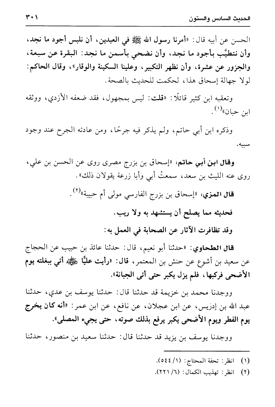 الحسن عن أبيه قال: "أمرنا رسول الله - صلى الله عليه وسلم - في العيدين، أن نلبس أجود ما نجد، وأن نتطيَّب بأجود ما نجد، وأن نضحي بأسمن ما نجد: البقرة عن سبعة، والجزور عن عشرة، وأن نظهر التكبير، وعلينا السكينة والوقار"، وقال الحاكم: لولا جهالة إسحاق هذا، لحكمت للحديث بالصحة.