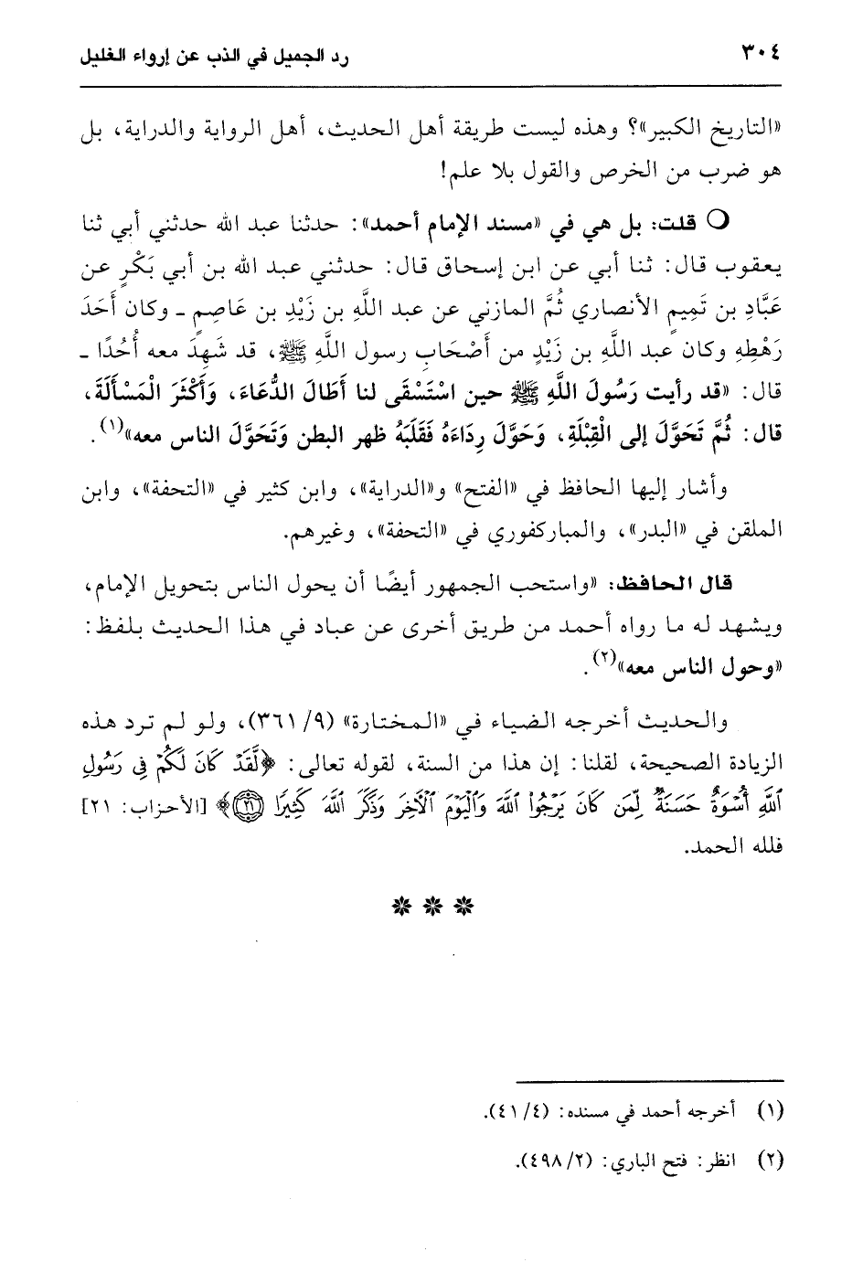 * قلت: بل هي في "مسند الإمام أحمد": حدثنا عبد الله حدثني أبي ثنا يعقوب قال: ثنا أبي عن ابن إسحاق قال: حدثني عبد الله بن أبي بَكْرٍ عن عَبَّادِ بن تَمِيمِ الأنصاري ثُمَّ المازني عن عبد اللَّهِ بن زَيْدِ بن عَاصِمٍ -وكان أَحَدَ رَهْطِهِ وكان عَبد اللَّهِ بن زَيْدٍ من أَصْحَابِ رسول اللَّهِ - صلى الله عليه وسلم -، قد شَهِدَ معه أُحُدًا- قال: "قد رأيت رَسُولَ اللَّهِ - صلى الله عليه وسلم - حين اسْتَسْقَى لنا أَطَالَ الدُّعَاءَ، وَأكْثَرَ الْمَسْأَلَةَ، قال: ثُمَّ تَحَوَّلَ إلى القبلة، وَحَوَّلَ رِدَاءَهُ فَقَلَبَهُ ظهر البطن وَتَحَوَّلَ الناس معه" (¬1).