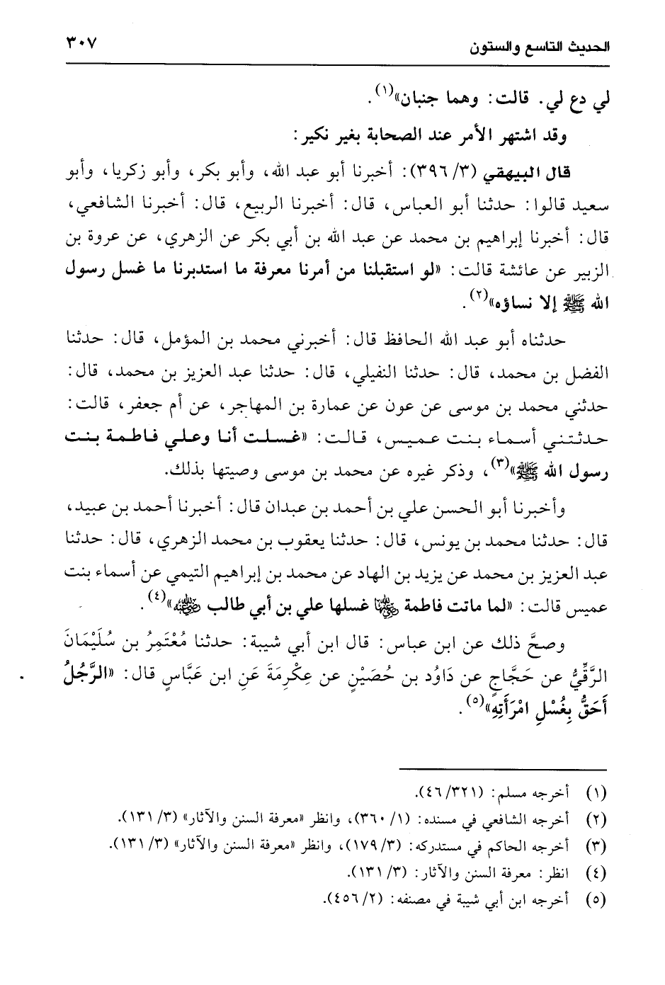 قال البيهقي (3/ 396): أخبرنا أبو عبد الله، وأبو بكر، وأبو زكريا، وأبو سعيد قالوا: حدثنا أبو العباس، قال: أخبرنا الربيع، قال: أخبرنا الشافعي، قال: أخبرنا إبراهيم بن محمد عن عبد الله بن أبي بكر عن الزهري، عن عروة بن الزبير عن عائشة قالت: "لو استقبلنا من أمرنا معرفة ما استدبرنا ما غسل رسول الله - صلى الله عليه وسلم - إلا نساؤه" (¬2).