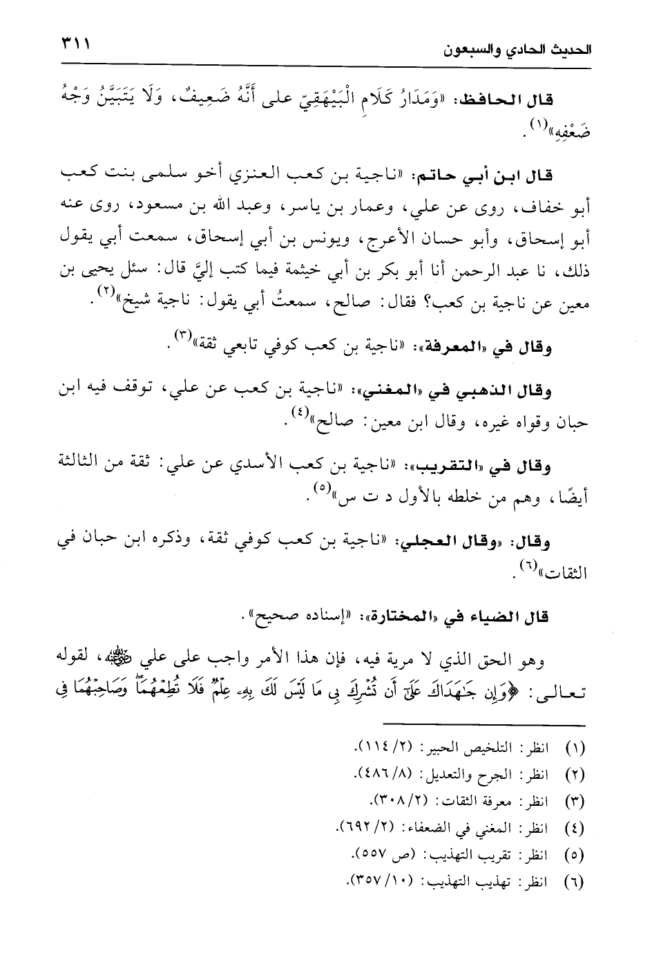 وقال الذهبي في "المغني": "ناجية بن كعب عن علي، توقف فيه ابن حبان وقواه غيره، وقال ابن معين: صالح" (¬4).