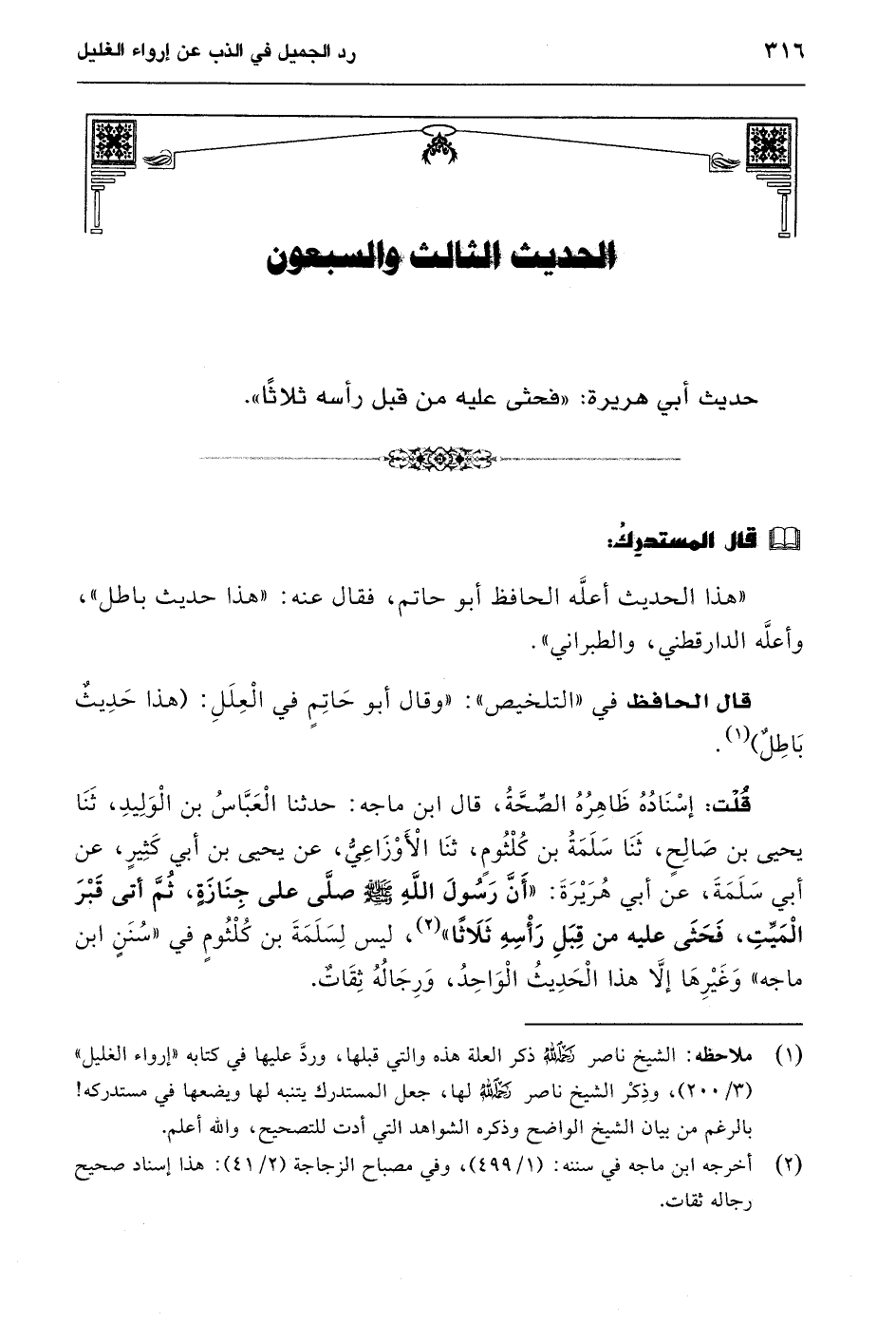 (¬1) ملاحظه: الشيخ ناصر رحمه الله ذكر العلة هذه والتي قبلها، وردَّ عليها في كتابه "إرواء الغليل" (3/ 200)، وذِكْر الشيخ ناصر رحمه الله لها، جعل المستدرك يتنبه لها ويضعها في مستدركه! بالرغم من بيان الشيخ الواضح وذكره الشواهد التي أدت للتصحيح، والله أعلم.
