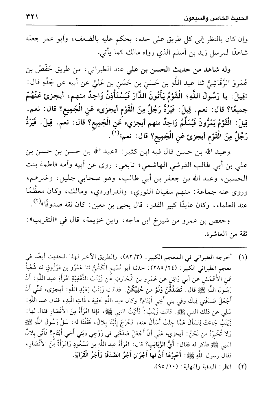 وعبد الله بن حسن قال فيه ابن كثير: "عبد الله بن حسن بن حسن بن علي بن أبي طالب القرشي الهاشمي؛ تابعي، روى عن أبيه وأمه فاطمة بنت الحسين، وعبد الله بن جعفر بن أبي طالب، وهو صحابي جليل، وغيرهم، وروى عنه جماعة: منهم سفيان الثوري، والدراوردي، ومالك، وكان معظَّمًا عند العلماء، وكان عابدًا كبير القدر، قال يحيى بن معين: كان ثقة صدوقًا" (¬2).