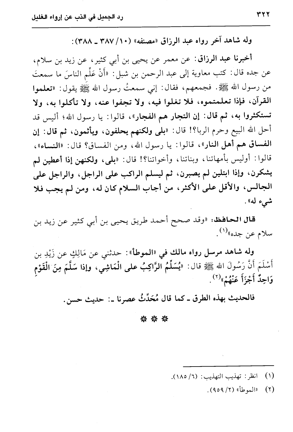 وله شاهد مرسل رواه مالك في "الموطأ": حدثني عن مَالِكٍ عن زَيْدِ بن أَسْلَمَ أَنَّ رَسُول الله قال: "يُسَلِّمُ الرَّاكِبُ على الْمَاشِي، وإذا سَلَّمَ مِنَ الْقَوْمِ واحد أَجْزَأَ عَنْهُمْ" (¬2).