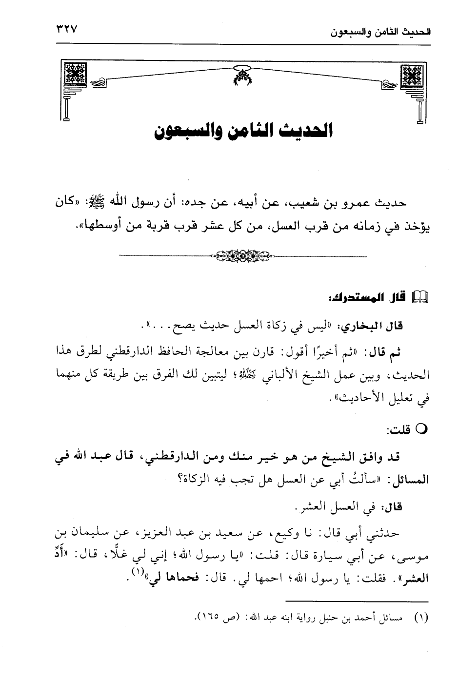 قد وافق الشيخ من هو خير منك ومن الدارقطني، قال عبد الله في المسائل: "سألتُ أبي عن العسل هل تجب فيه الزكاة؟