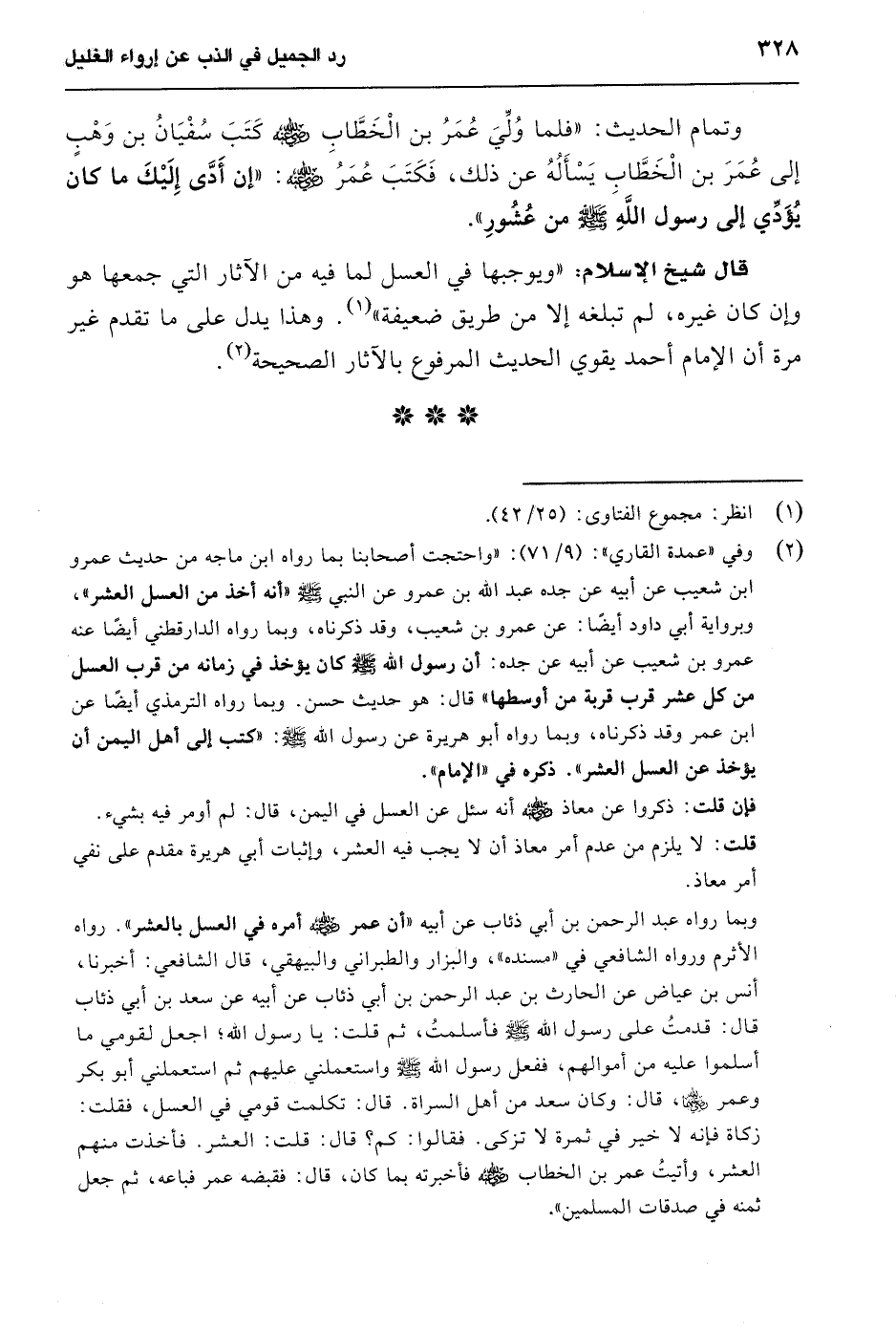 (¬2) وفي "عمدة القاري": (9/ 71): "واحتجت أصحابنا بما رواه ابن ماجه من حديث عمرو ابن شعيب عن أبيه عن جده عبد الله بن عمرو عن النبي - صلى الله عليه وسلم- "أنه أخذ من العسل العشر"، وبرواية أبي داود أيضًا: عن عمرو بن شعيب، وقد ذكرناه، وبما رواه الدارقطني أيضًا عنه عمرو بن شعيب عن أبيه عن جده: أن رسول الله - صلى الله عليه وسلم - كان يؤخذ في زمانه من قرب العسل من كل عشر قرب قربة من أوسطها" قال: هو حديث حسن. وبما رواه الترمذي أيضًا عن ابن عمر وقد ذكرناه، وبما رواه أبو هريرة عن رسول الله - صلى الله عليه وسلم -: "كتب إلى أهل اليمن أن يؤخذ عن العسل العشر". ذكره في "الإمام".