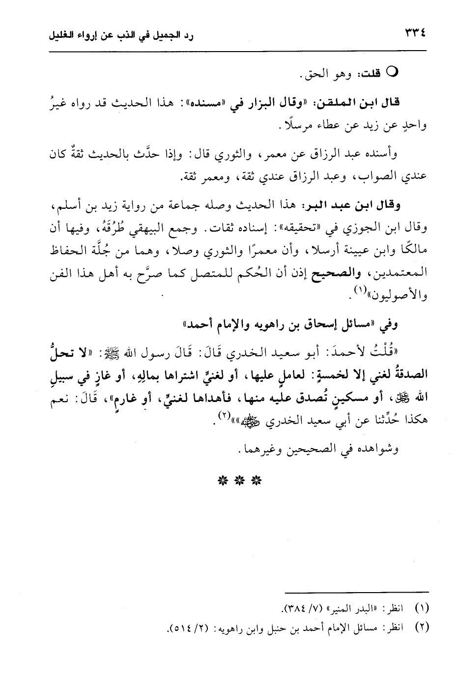 "قُلْتُ لأحمدَ: أبو سعيد الخدري قَالَ: قَالَ رسول الله - صلى الله عليه وسلم -: "لا تحلُّ الصدقةُ لغني إلا لخمسةٍ: لعاملٍ عليها، أو لغنيٍّ اشتراها بمالِهِ، أو غازٍ في سبيلِ الله عز وجل، أو مسكينٍ تُصدق عليه منها، فأهداها لغنيٍّ، أو غارمٍ"، قَالَ: نعم هكذا حُدِّثنا عن أبي سعيد الخدري - رضي الله عنه"" (¬2).