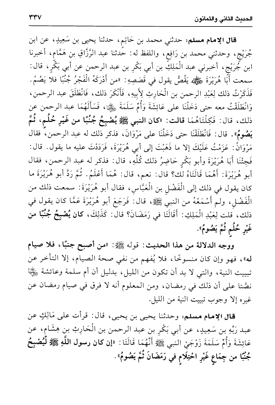 قال الإمام مسلم: حدثني محمد بن حَاتِمٍ، حدثنا يحيى بن سَعِيدٍ، عن ابن جُرَيْجٍ، وحدثني محمد بن رَافِعِ، واللفظ له: حدثنا عبد الرَّزَّاقِ بن هَمَّامٍ، أخبرنا ابن جُرَيْجٍ، أخبرني عبد الْمَلِكِ بن أبي بَكْرِ بن عبد الرحمن عن أبي بَكْرٍ، قال: سمعت أَبَا هُرَيْرَةَ -رضي الله عنه- يَقُصُّ يقول في قَصَصِهِ: "من أَدْرَكَهُ الْفَجْرُ جُنُبًا فلا يَصُمْ. فَذَكَرْتُ ذلك لِعَبْدِ الرحمن بن الْحَارِثِ لأَبِيهِ، فَأَنْكَرَ ذلك، فَانْطَلَقَ عبد الرحمن، وَانْطَلَقْتُ معه حتى دَخَلْنَا على عَائِشَةَ وَأُمِّ سَلَمَةَ - رضي الله عنها-، فَسَأَلَهُمَا عبد الرحمن عن ذلك، قال: فَكِلْتاهُمَا قالت: "كان النبي - صلى الله عليه وسلم - يُصْبِحُ جُنُبًا من غَيْرِ حُلُمٍ، ثُمَّ يَصُومُ". قال: فَانْطَلَقْنَا حتى دَخَلْنَا على مَرْوَانَ، فذكر ذلك له عبد الرحمن، فقال مَرْوَانُ: عَزَمْتُ عَلَيْكَ إلا ما ذَهَبْتَ إلى أبي هُرَيْرَةَ، فَرَدَدْتَ عليه ما يقول. قال: فَجِئْنَا أَبَا هُرَيْرَةَ وأبو بَكْرٍ حَاضِرُ ذلك كُلِّهِ، قال: فذكر له عبد الرحمن، فقال أبو هُرَيْرَةَ: أَهُمَا قَالَتَاهُ لك؟ قال: نعم، قال: هُمَا أَعْلَمُ. ثُمَّ رَدَّ أبو هُرَيْرَةَ ما كان يقول في ذلك إلى الْفَضلِ بن الْعَبَّاسِ، فقال أبو هُرَيْرَةَ: سمعت ذلك من الْفَضْلِ، ولم أَسْمَعْهُ من النبي - صلى الله عليه وسلم -، قال: فَرَجَعَ أبو هُرَيْرَة عَمَّا كان يقول في ذلك، قلت لِعَبْدِ الْمَلِكِ: أقَالَتَا في رَمَضانَ؟ قال: كَذَلِكَ، كان يُصْبِحُ جُنُبًا من غَيْرِ حُلُمٍ ثُمَّ يصومُ".