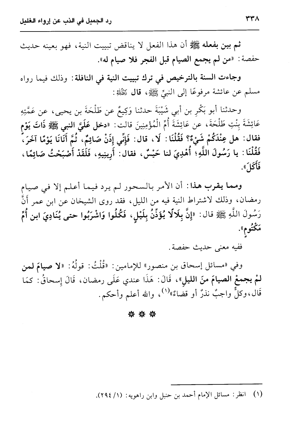 وجاءت السنة بالترخيص في ترك تبييت النية في النافلة: وذلك فيما رواه مسلم عن عائشة مرفوعًا إلى النبيِّ - صلى الله عليه وسلم -، قال رحمه الله: