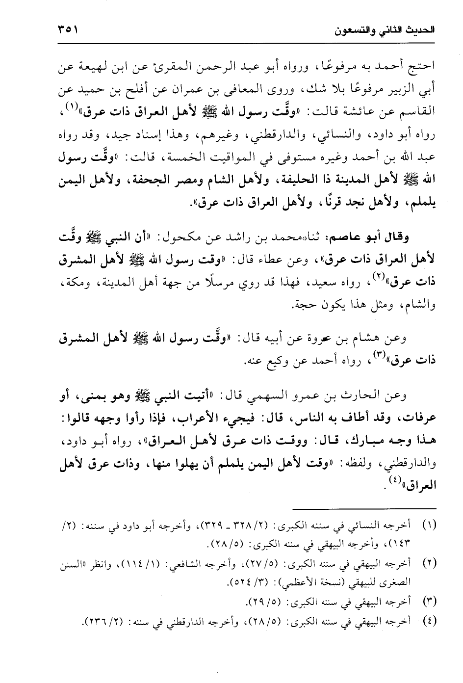 وعن الحارث بن عمرو السهمي قال: "أتيت النبي - صلى الله عليه وسلم - وهو بمنى، أو عرفات، وقد أطاف به الناس، قال: فيجيء الأعراب، فإذا رأوا وجهه قالوا: هذا وجه مبارك، قال: ووقت ذات عرق لأهل العراق"، رواه أبو داود، والدارقطني، ولفظه: "وقت لأهل اليمن يلملم أن يهلوا منها، وذات عرق لأهل العراق" (¬4).