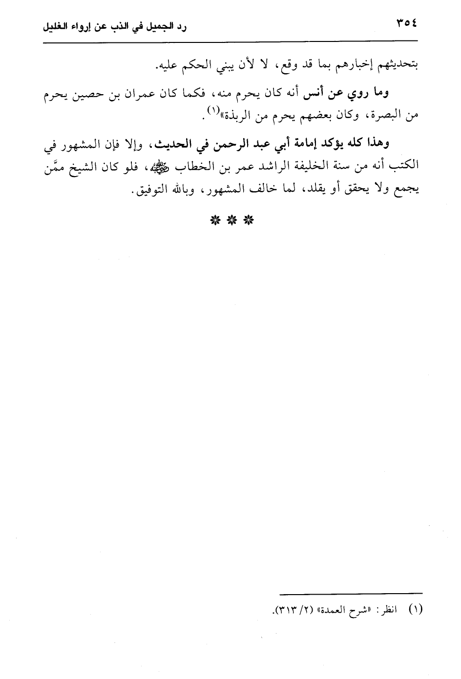 وهذا كله يؤكد إمامة أبي عبد الرحمن في الحديث، وإلا فإن المشهور في الكتب أنه من سنة الخليفة الراشد عمر بن الخطاب -رضي الله عنه-، فلو كان الشيخ ممَّن يجمع ولا يحقق أو يقلد، لما خالف المشهور، وبالله التوفيق.